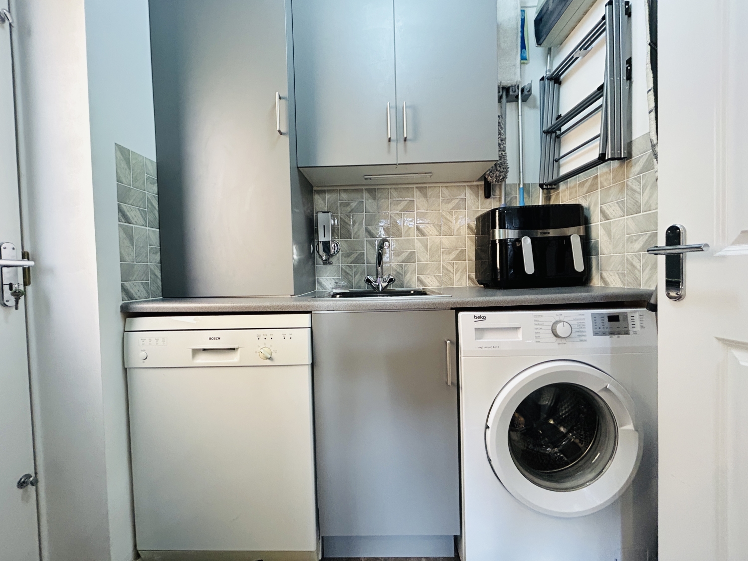 A separate utility room adds convenience, providing additional storage, worktop space, and plumbing for a dishwasher and washing machine, along with a sink unit and a concealed modern gas combi boiler. A side door gives access to the exterior and a paved bin storage area.