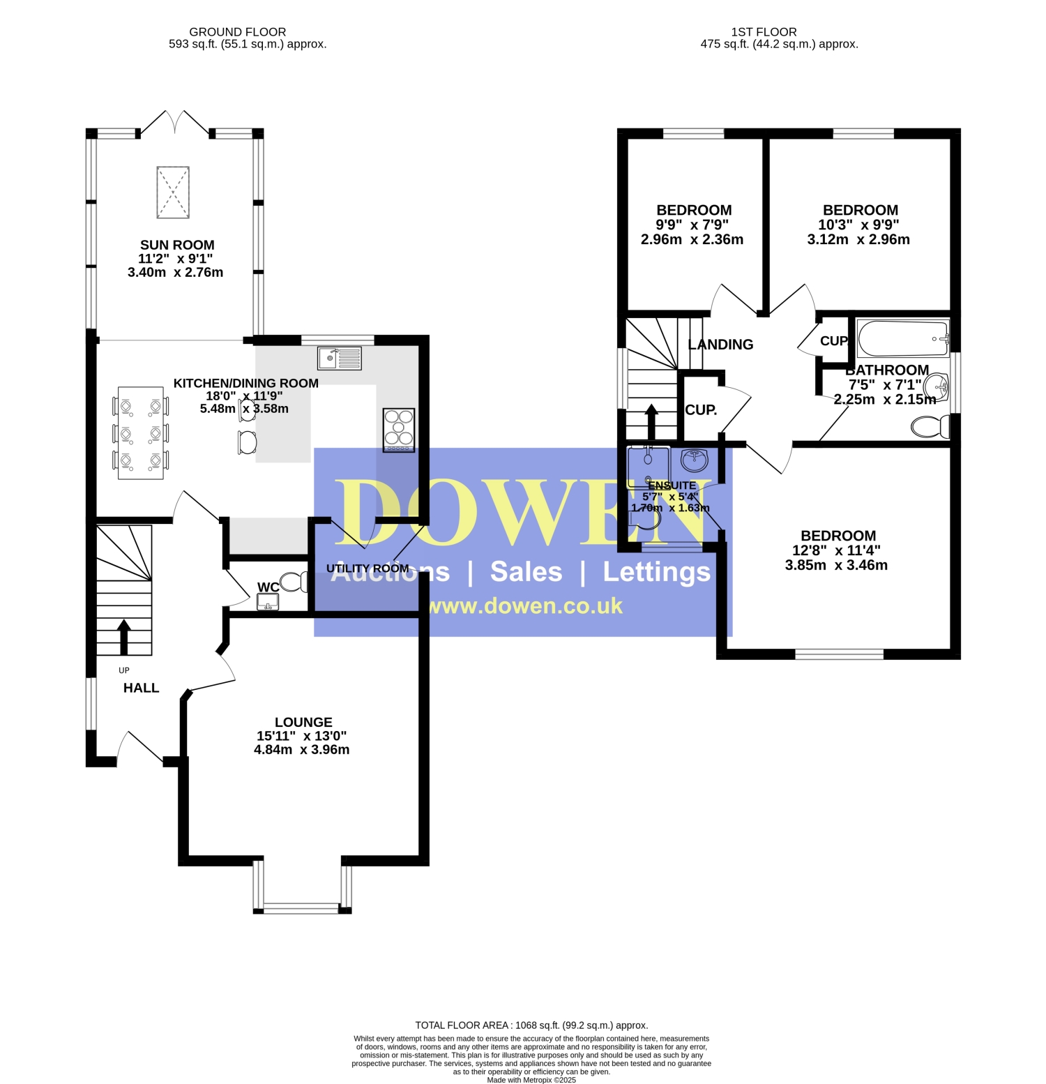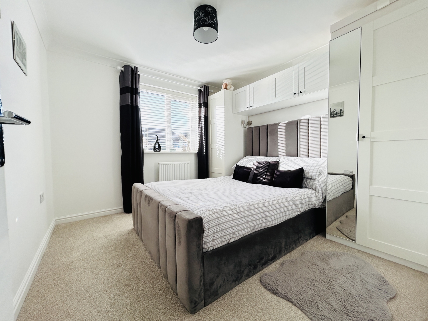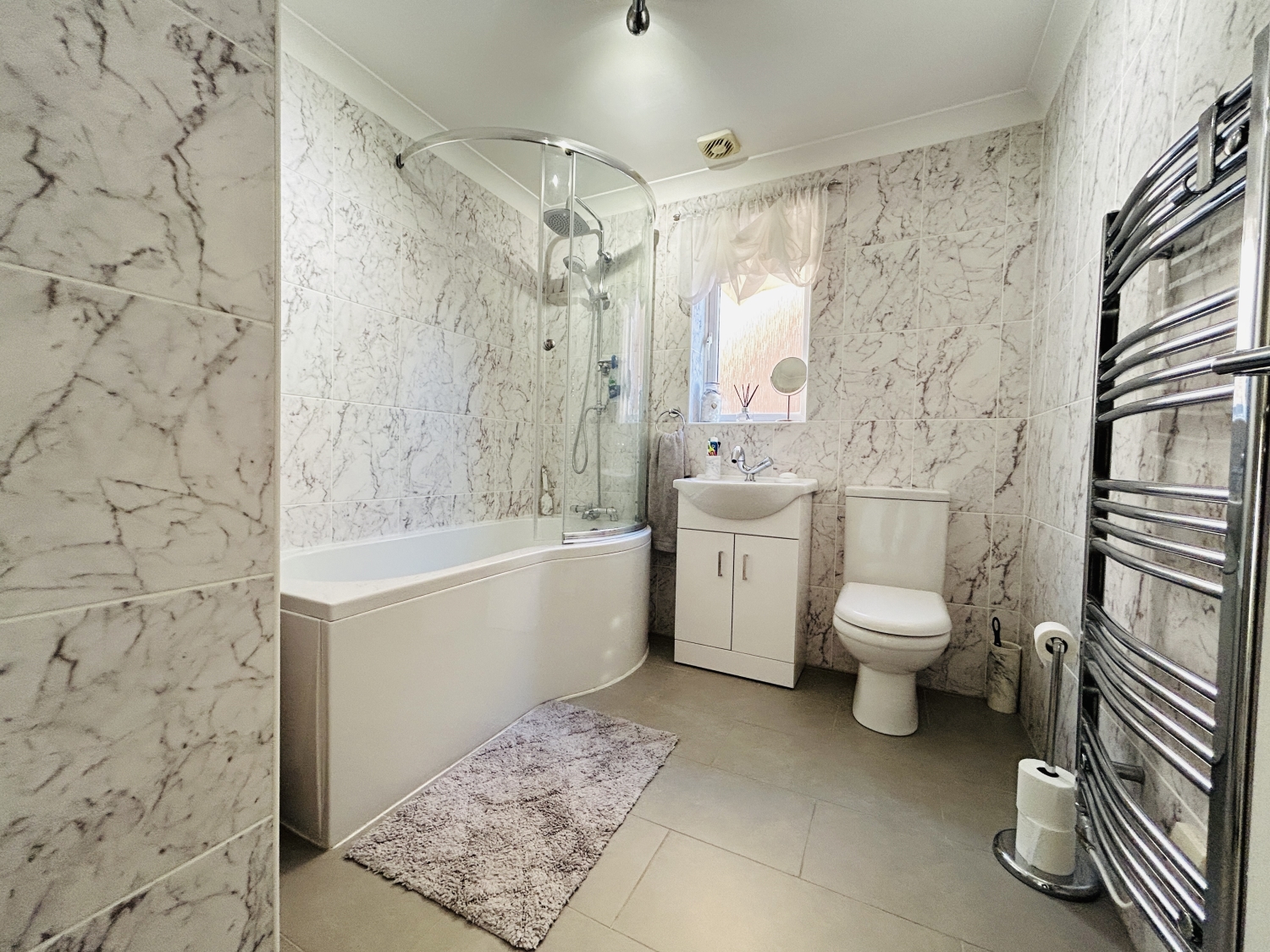 Upstairs, a spacious landing with window, loft access, and storage cupboard leads to three generously sized double bedrooms. The principal bedroom benefits from a stylish en-suite shower room with shower enclosure, WC, and washbasin. Completing the first floor is a luxurious family bathroom featuring a modern suite, chrome towel rail, and marble-effect tiling.