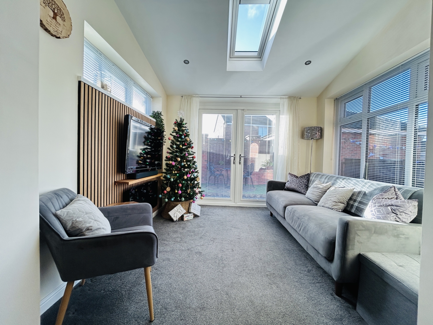 Inside, the home opens with a welcoming hallway featuring a useful built-in storage cupboard and access to the upgraded ground floor cloakroom/WC. From here, you enter a delightful and well-proportioned lounge with a bay window and a stylish media wall as its focal point. The modern kitchen is both elegant and practical, offering a range of storage units, quality worktops, and a breakfast bar for ample preparation space. It includes a double oven cooking range with extractor hood and space for appliances. The kitchen flows seamlessly into the dining area, which leads to a stunning sun lounge extension with a semi-vaulted ceiling, feature skylight, and patio doors opening onto the attractive rear garden.