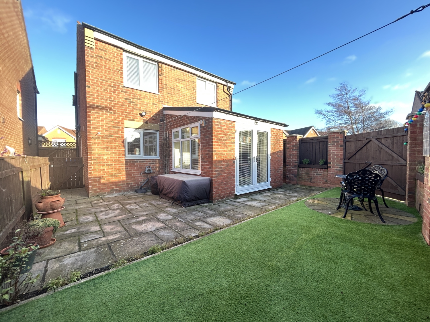 Externally, the property occupies a desirable corner plot with well-maintained lawned gardens to the front and side, and a private enclosed garden to the rear with an attractive paved patio and high-quality imitation lawn. A driveway at the rear provides access to a single garage equipped with light, power, and a personnel door leading into the garden.