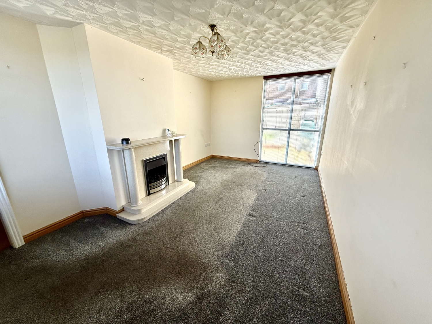 Double glazed UPVC window to the front, central heating radiator, double glazed window to the rear, textured ceiling and contemporary style feature fire place with matching hearth and insert housing a living flamed gas fire.