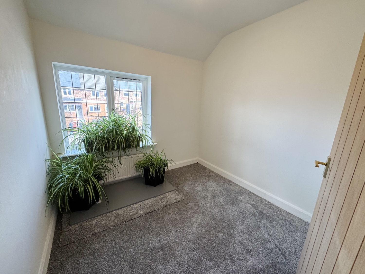 Fitted with a modern wall and base units with complementing work surfaces, gas hob, electric oven, extractor hood, ceramic sink with drainer and mixer tap, extractor fan, space for dryer, plumbing for washing machine, radiator, double glazed windows to both the front and side elevation, composite door to the front elevation