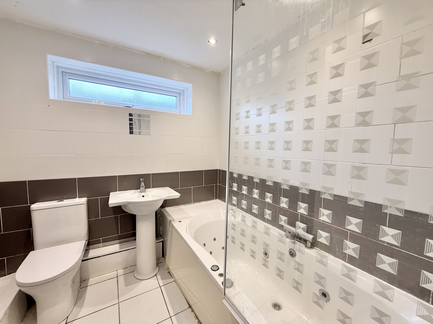 Bathroom suite comprising of low level WC, hand wash basin, panelled bath with shower over, shower screen, tiling to floor and walls, double glazed window, radiator.