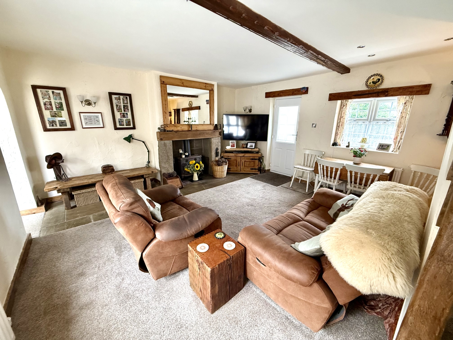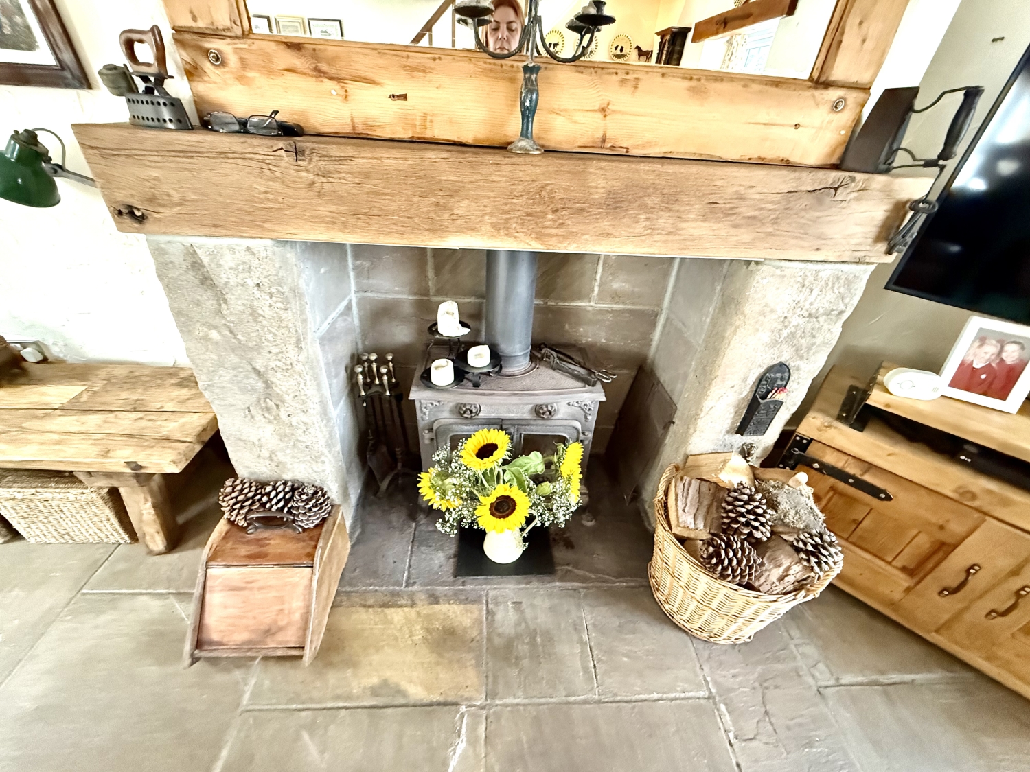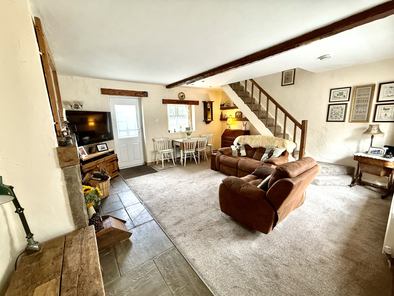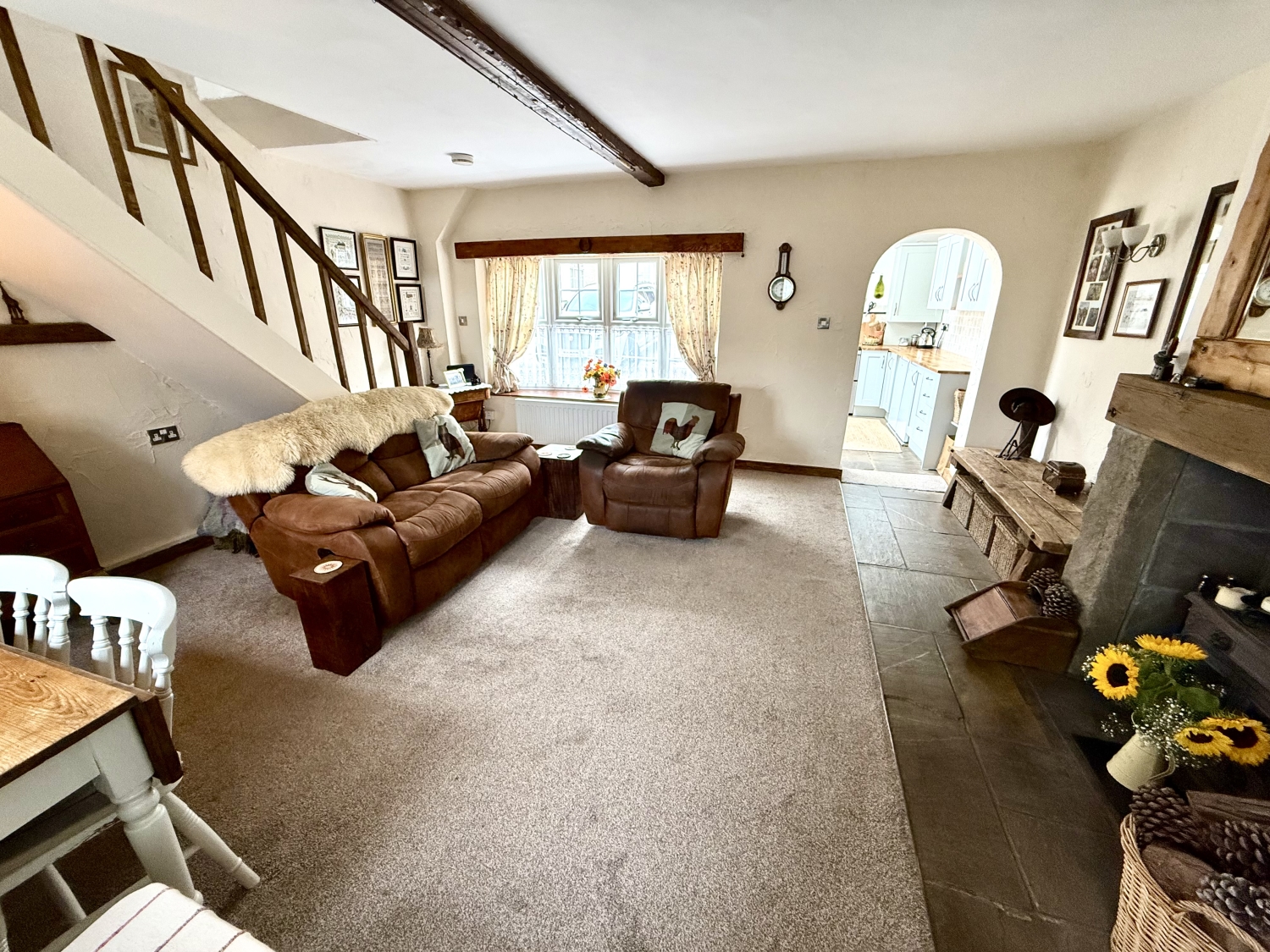 Open stairs to the first floor, double glazed leaded window to the rear, double glazed leaded bow window to the front, two central heating radiators, beam ceiling, Inglenook style feature fire place housing multi fuel stove.