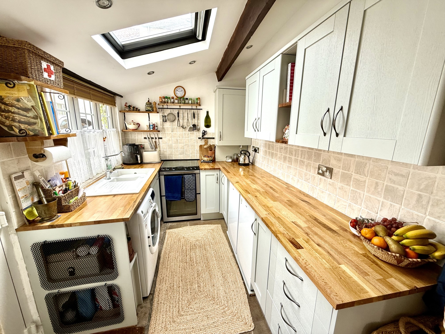 Fitted with a quality range of the shaker wall and base units, having butchers block work surfaces, incorporating a white porcelain sink unit with the antique type mixer tap. Velux window, double glazed leaded window to the side, stone flooring, plumbing for an automatic machine, UPVC external door and splashback tiling.