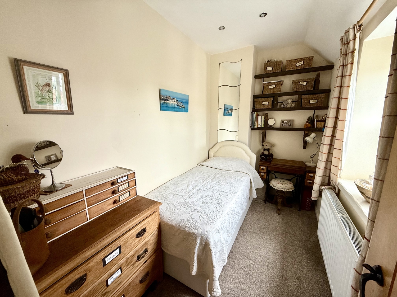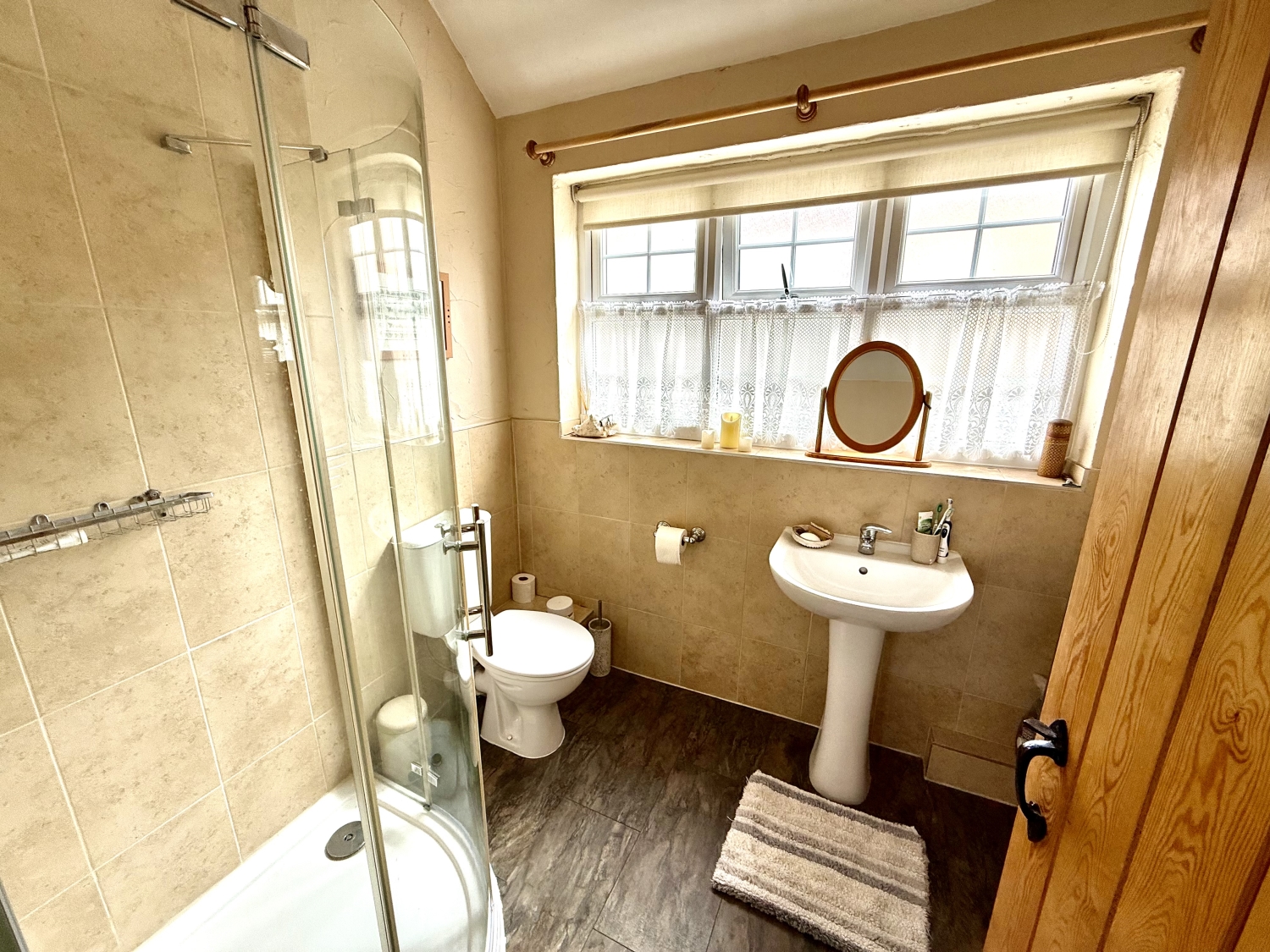 Fitted with a white three piece suite comprising a walk in shower cubicle, pedestal wash hand basin and low level WC. Splashback tiling, double glazed frosted leaded window to the rear, downlighters, chrome heated towel rail and tiled flooring.