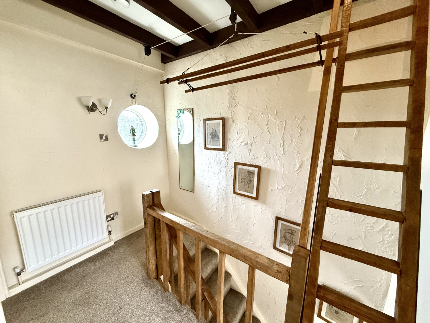 Port hole double glazed frosted window to the rear, central heating radiator, access to the boarded loft room and beamed ceiling.