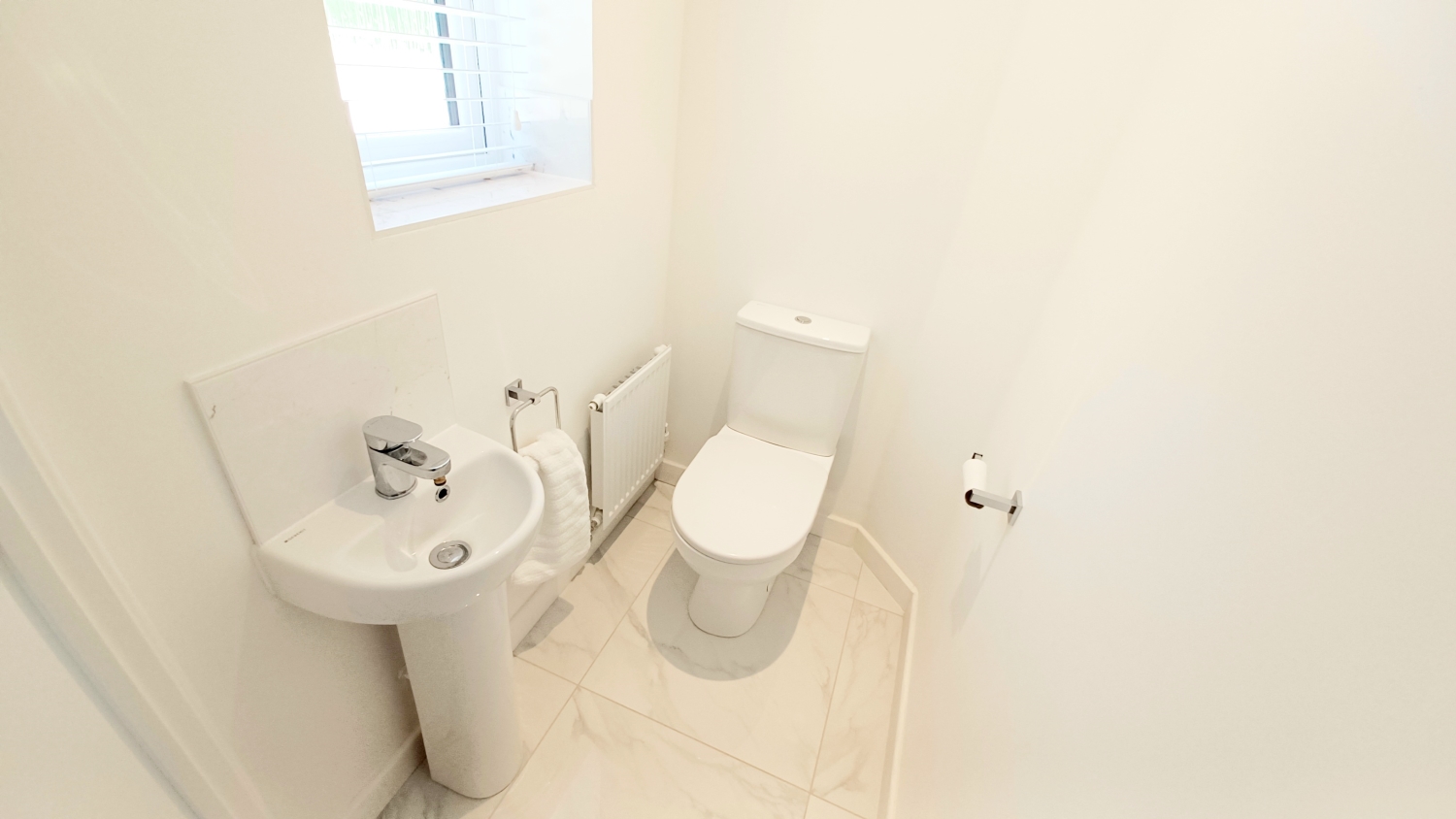 Low level WC, pedestal handwash basin, tiling to splashbacks, upvc framed double glazed window, radiator, tiled flooring, inset spotlights to ceiling.