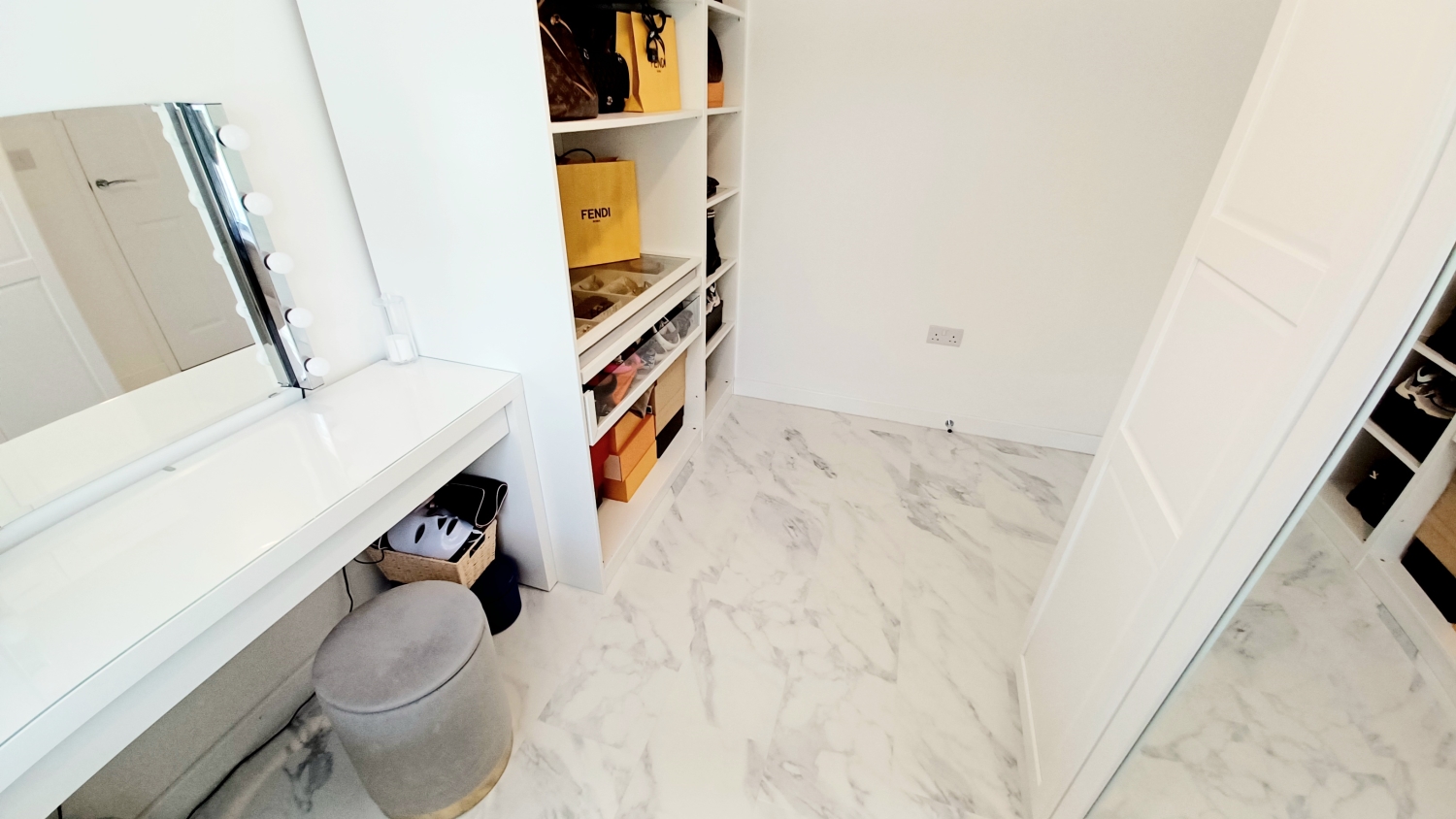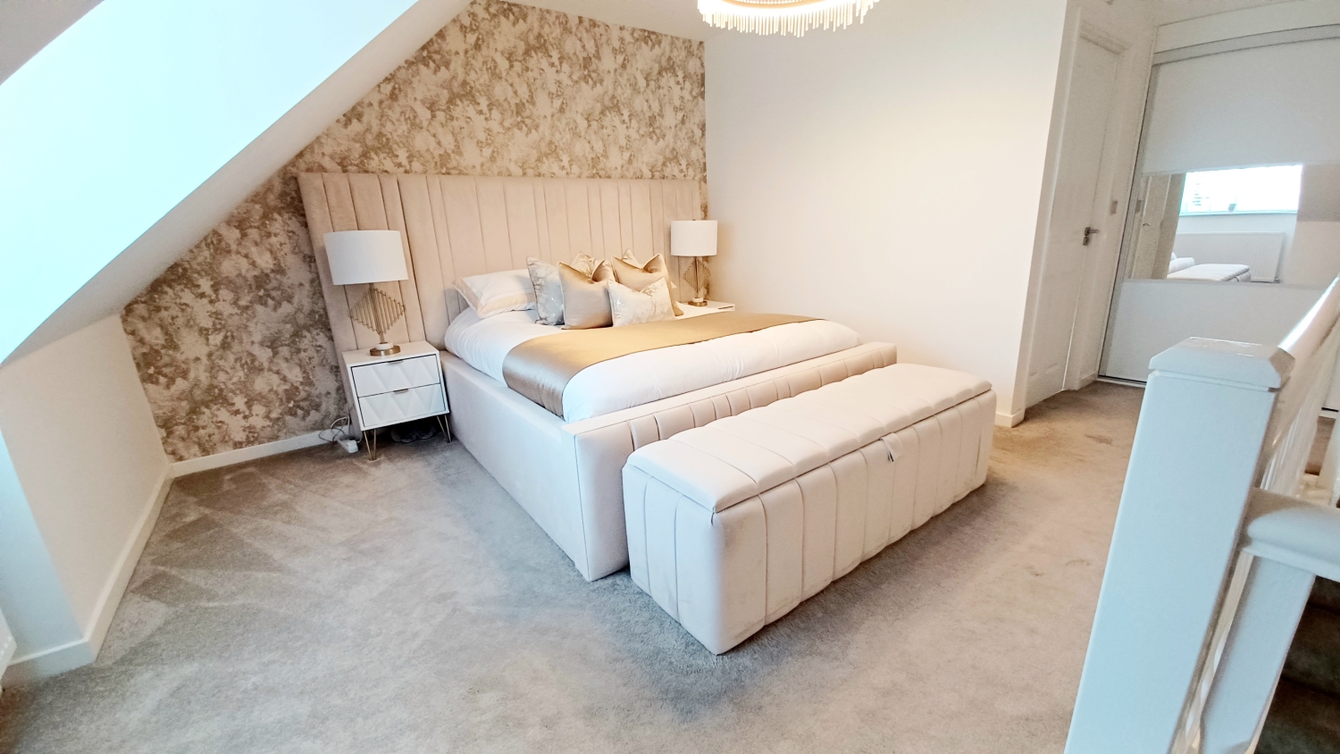 Fitted with a very well appointed 3 piece suite comprising a corner shower cubicle with overhead shower, pedestal handwash basin, low level WC, tiling to splashbacks, double glazed velux window, radiator, tiled flooring, extractor, inset spotlights to ceiling, storage cupboard.