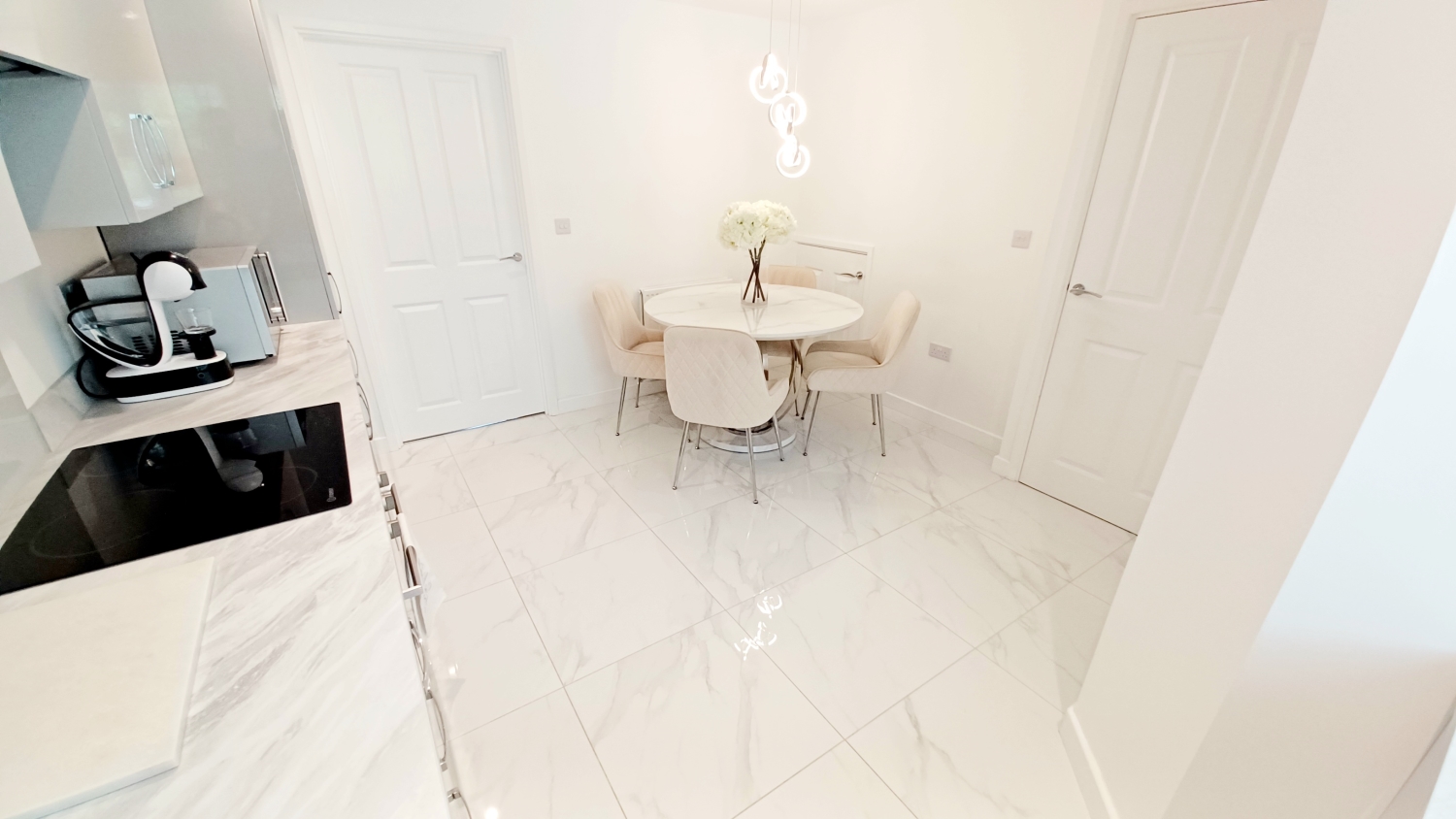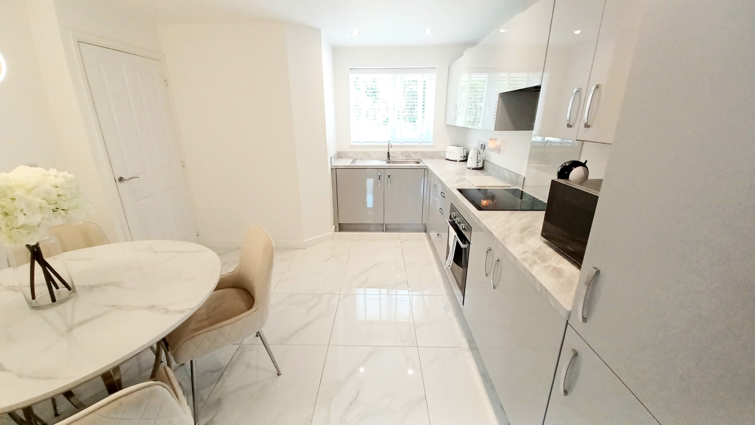 Fitted with a stunning range of modern base and wall units finished in grey, heat resistant worktops, stainless steel sink unit with mixer tap, integrated oven with hob and extractor, integrated washing machine, integrated fridge freezer, tiled flooring, upvc framed double glazed window, radiator, inset spotlights to ceiling, storage cupboard, ample room for dining table and chairs, inset spotlights to ceiling.