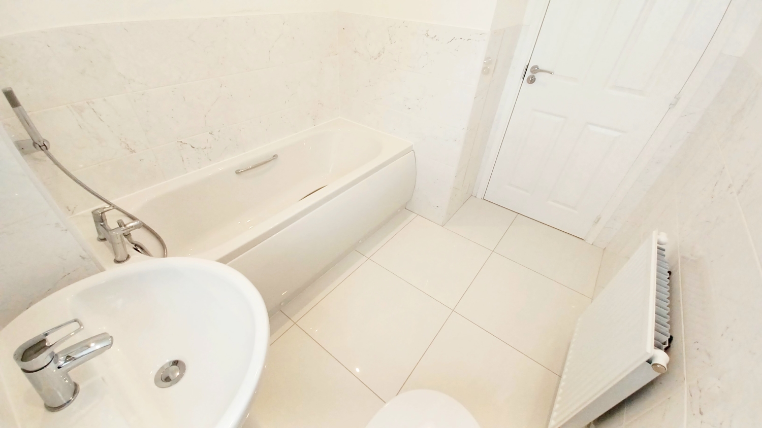 Fitted with a very well appointed 3 piece suite comprising a panel bath with shower attachment, pedestal handwash basin, low level WC, part tiling to the walls, upvc framed double glazed window, radiator, tiled flooring, extractor, inset spotlights to ceiling.