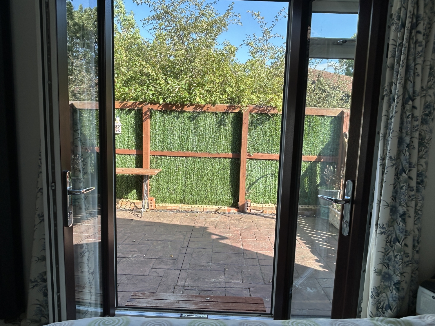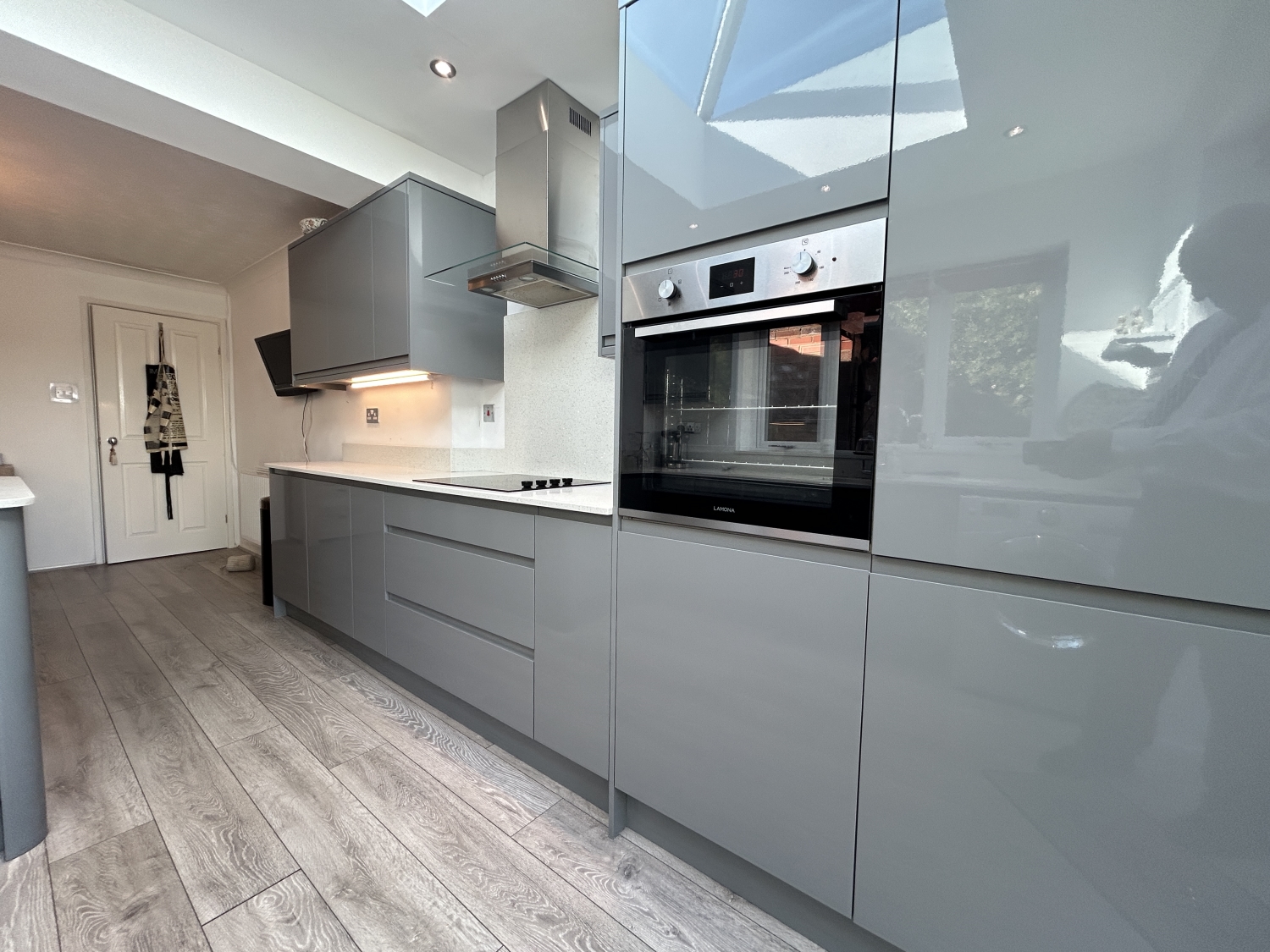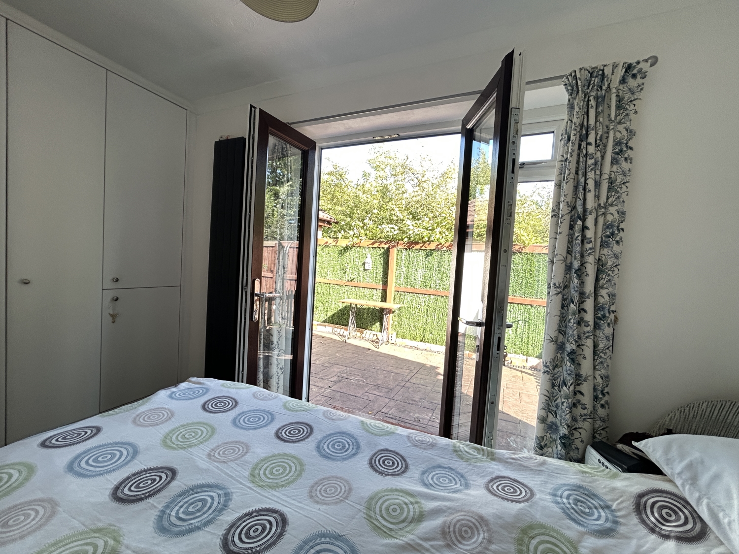 The master bedroom is a generous double with fitted wardrobes, while the second bedroom is a spacious single, also featuring fitted robes and French patio doors opening onto the side garden. A standout feature of this home is the stunning open-plan dining area, which flows seamlessly into the kitchen extension. The kitchen itself is finished with sleek high-gloss units, integrated appliances, and an atrium-style skylight that floods the space with natural light. Patio doors open directly to the rear garden, perfect for indoor-outdoor living.