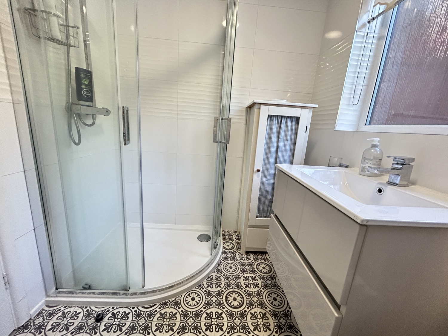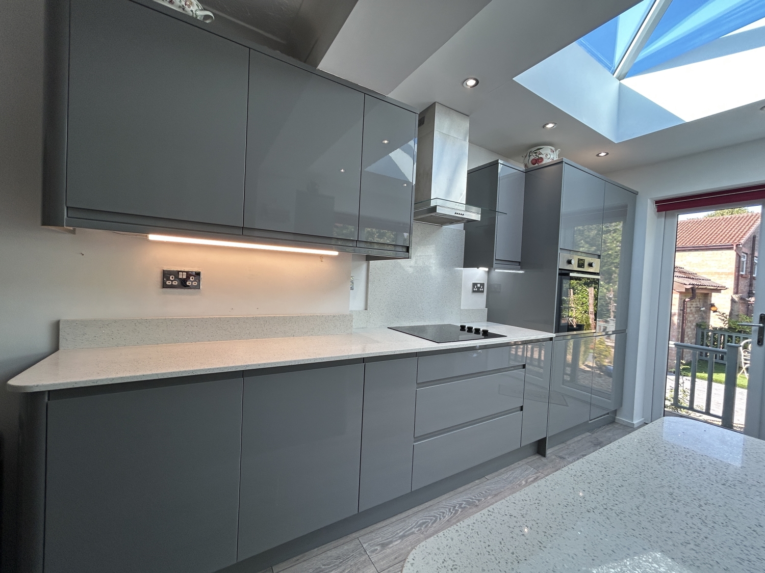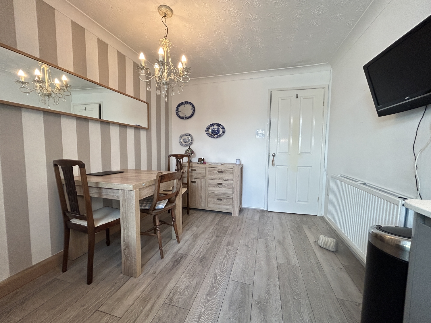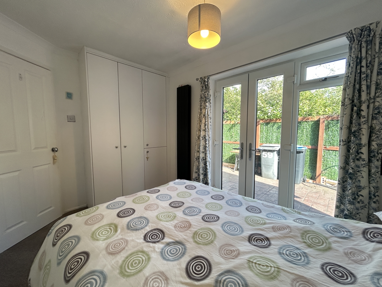 The master bedroom is a generous double with fitted wardrobes, while the second bedroom is a spacious single, also featuring fitted robes and French patio doors opening onto the side garden. A standout feature of this home is the stunning open-plan dining area, which flows seamlessly into the kitchen extension. The kitchen itself is finished with sleek high-gloss units, integrated appliances, and an atrium-style skylight that floods the space with natural light. Patio doors open directly to the rear garden, perfect for indoor-outdoor living.