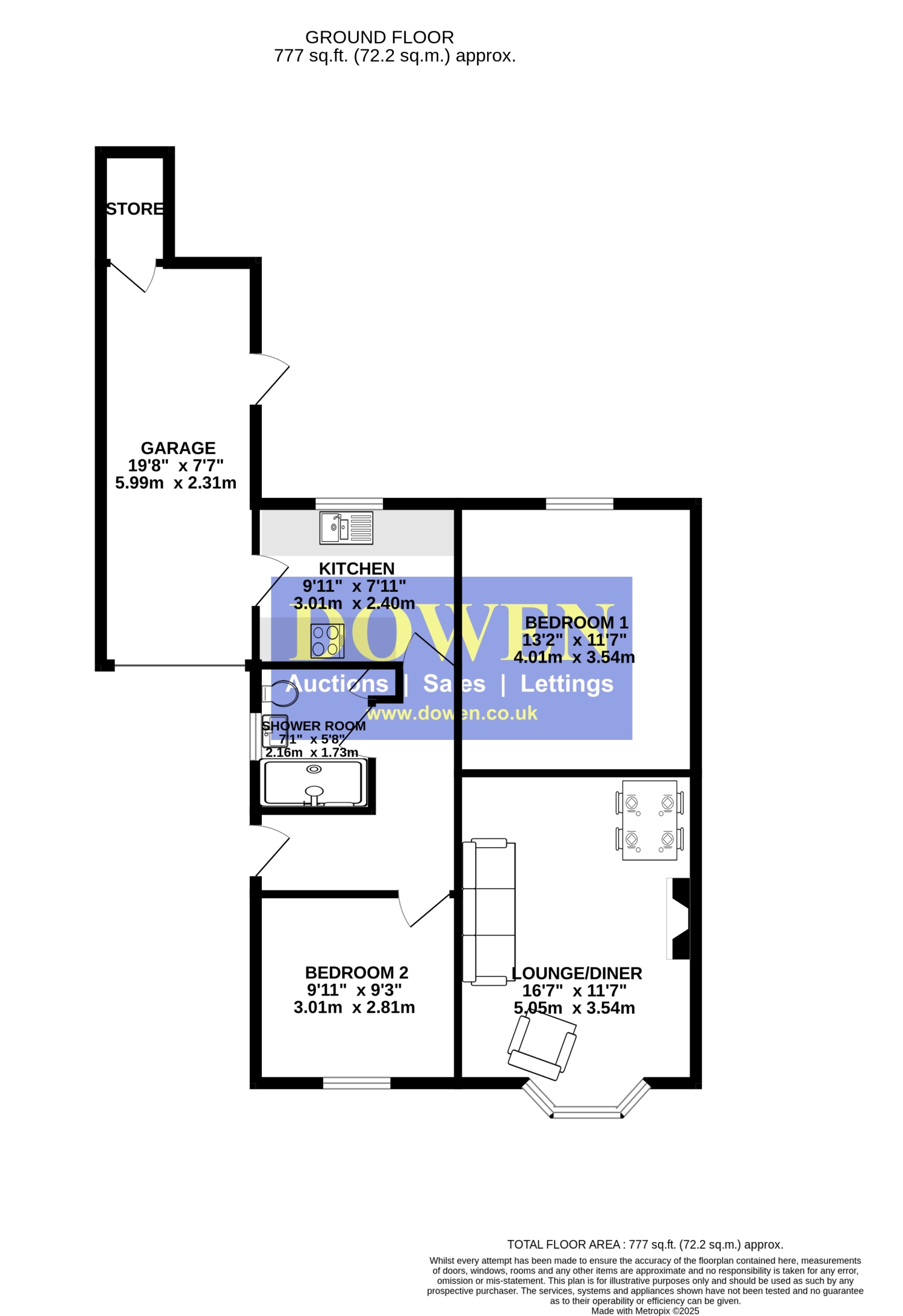 The spacious accommodation includes two double bedrooms, a bright open-plan lounge dining room dining room with bay window, a modern refitted kitchen, and a contemporary shower room. Externally, the property benefits from well-kept gardens to the front and rear, a private rear garden, a double driveway, and a garage with additional storage room.