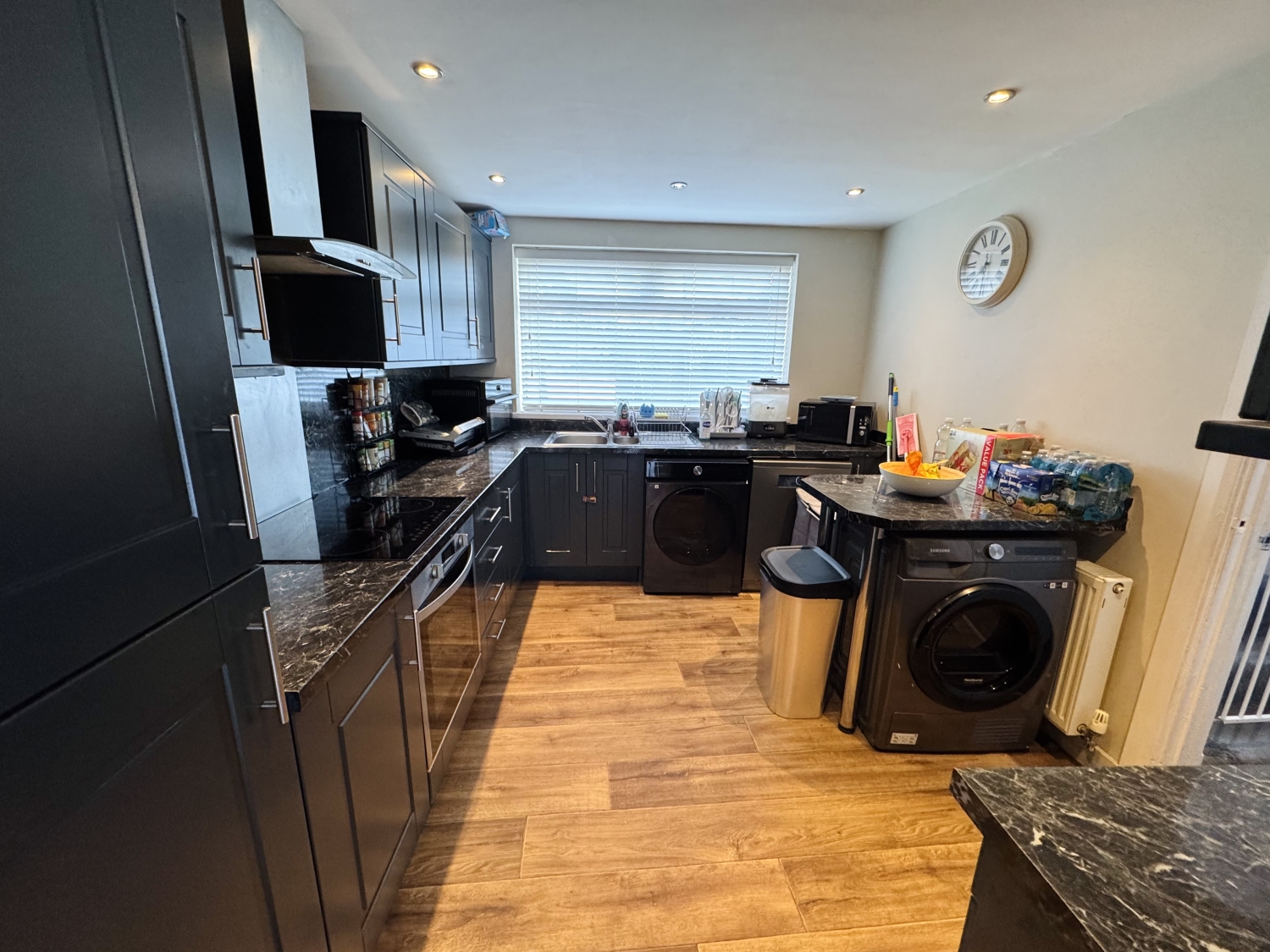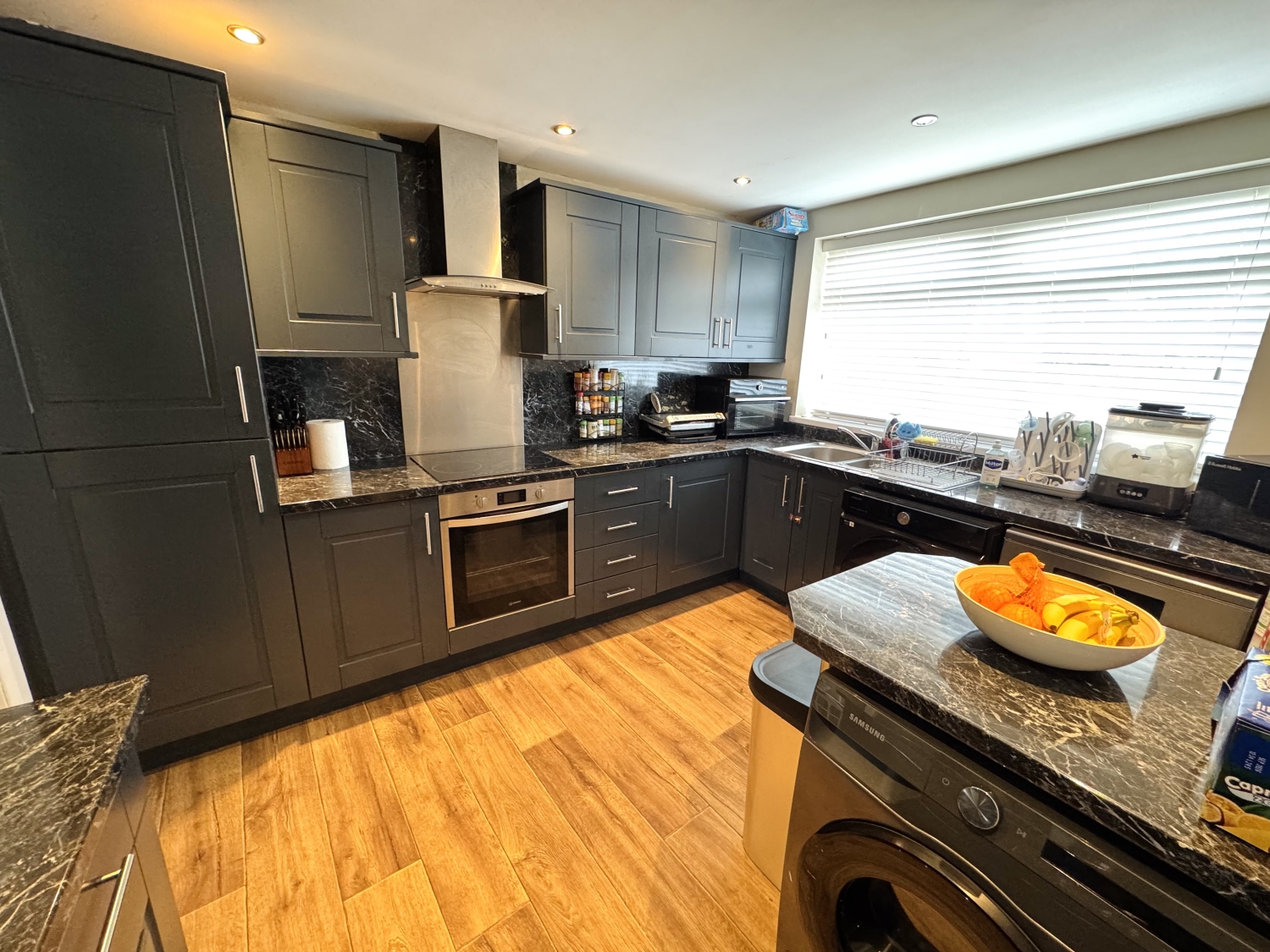 Fitted with a range of wall and base units with complementing work surfaces, breakfast bar and splash backs, stainless steel sink with drainer and mixer tap, integrated fridge/freezer, electric hob, electric oven, extractor hood, space for washing machine, space for dishwasher, radiator, spotlights to ceiling, double glazed window to the front elevation