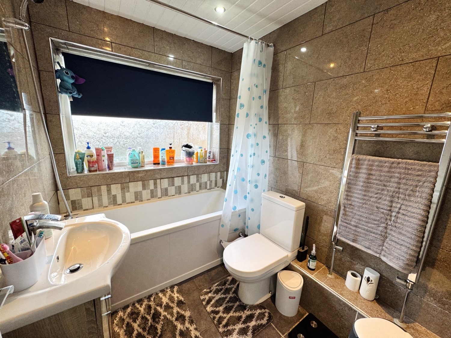 Fitted with a 4 piece suite comprising of; Bath, separate shower, vanity wash hand basin, low level w/c, heated towel rail, spotlights to ceiling, tiled flooring, tiled walls, double glazed window to the front elevation