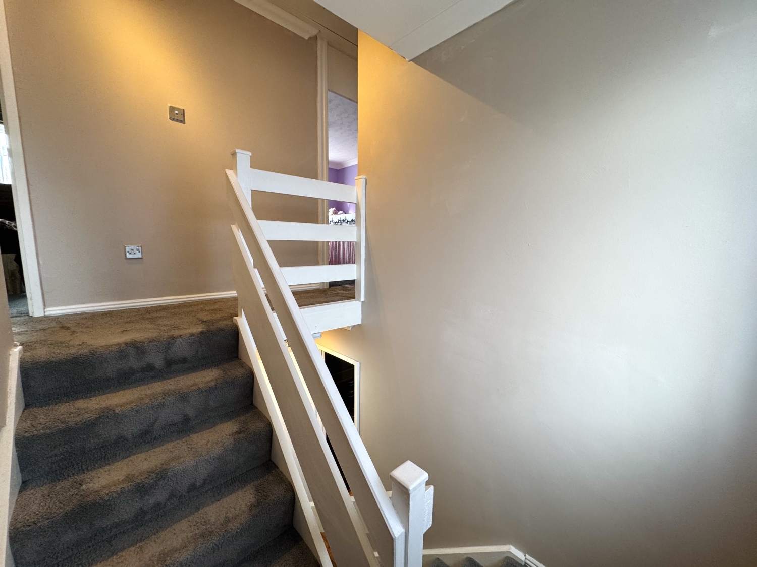 UPVC Door, two storage cupboards, radiator, stairs leading to the first floor landing