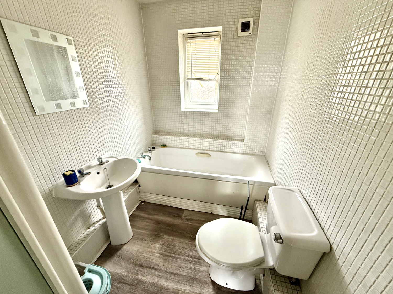 Fitted with a four piece suite comprising a panel bath, pedestal wash hand basin, low level WC and walk in shower cubicle. Fully tiled walls, downlighters, double glazed frosted window to the front and central heating radiator.