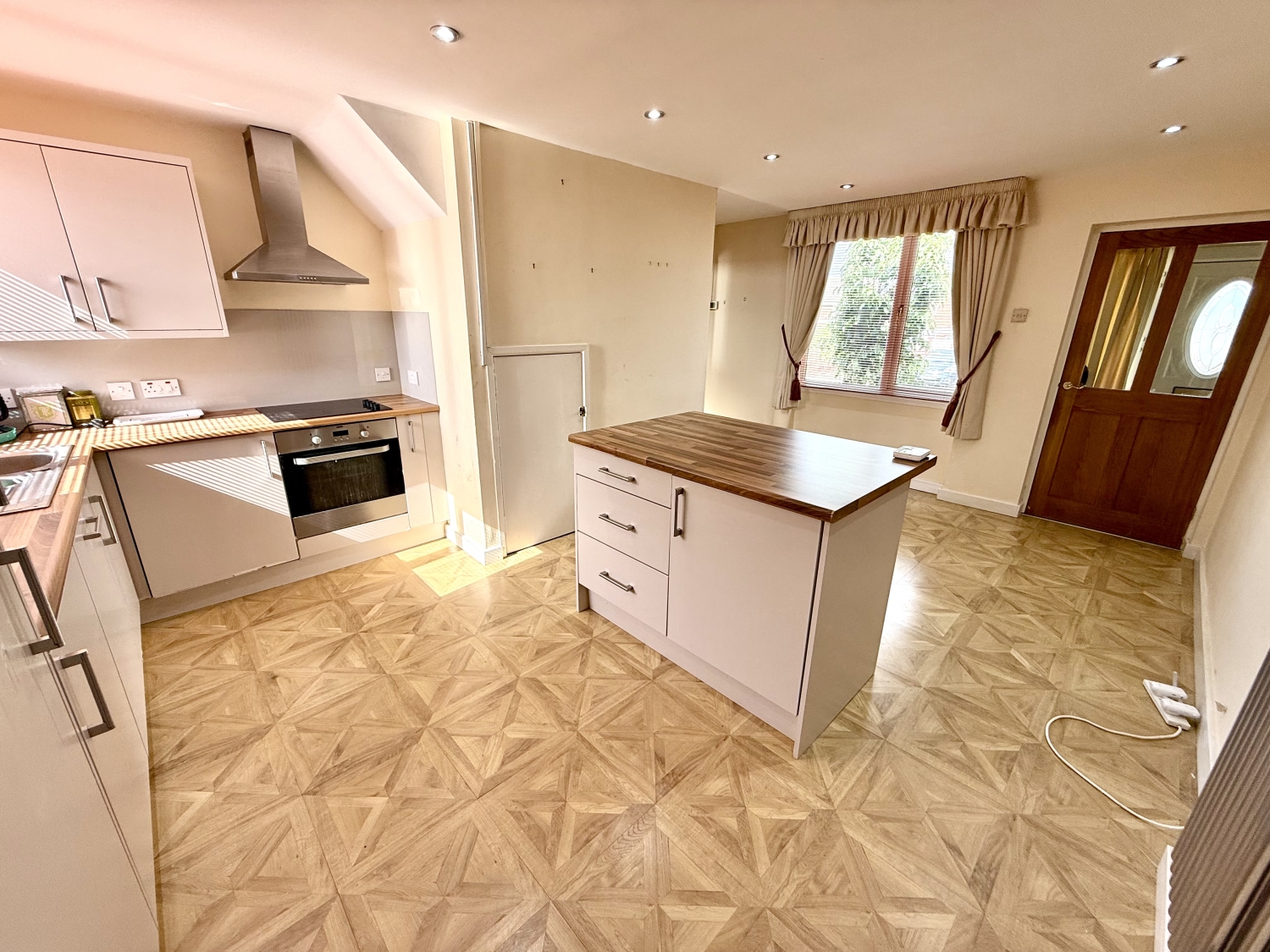 UPVC external door, laminate flooring and textured ceiling.