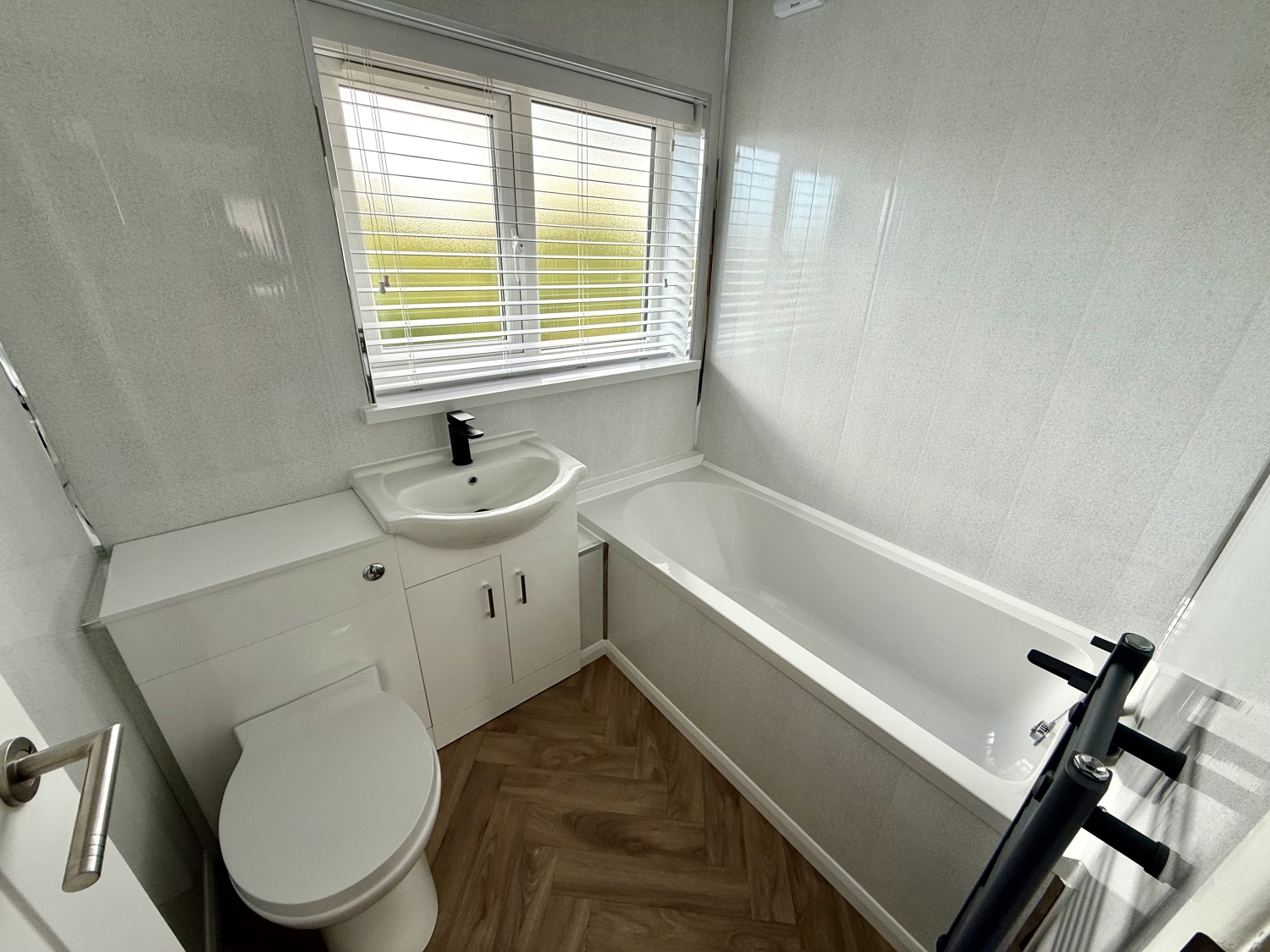 Refitted with a white three piece suite comprising a panel bath with mixer tap shower over, vanity wash hand basin and WC. Double glazed frosted window to the rear, state of the art fully panelled walls and ceiling, extractor fan and heated towel rail.