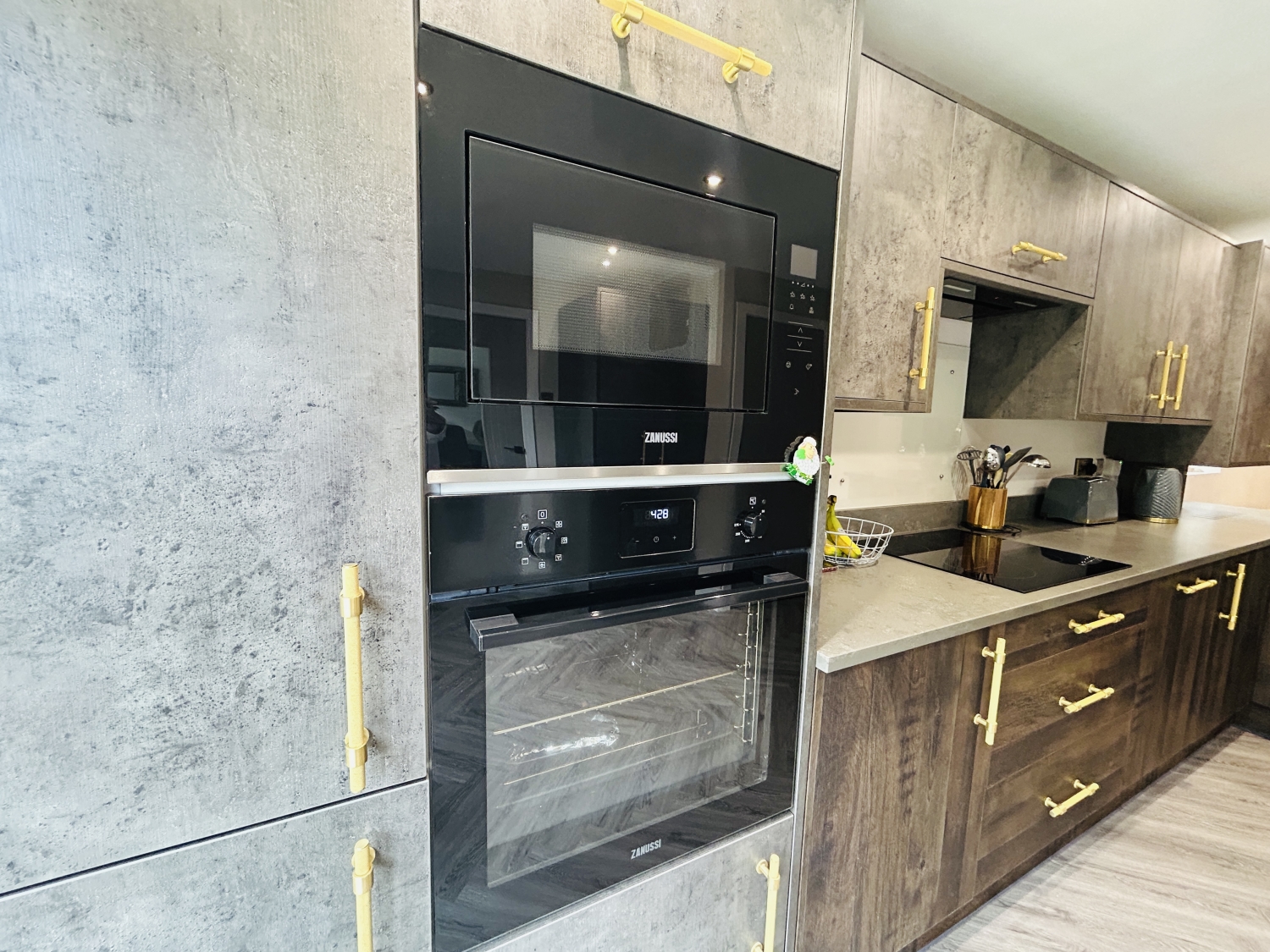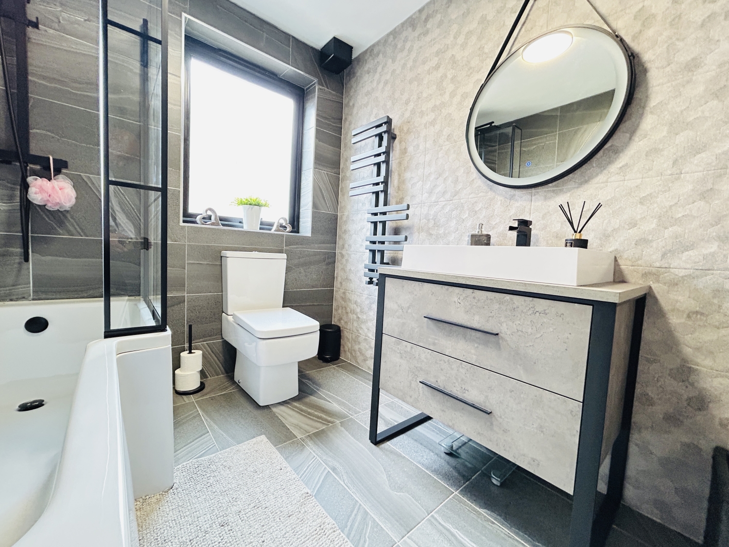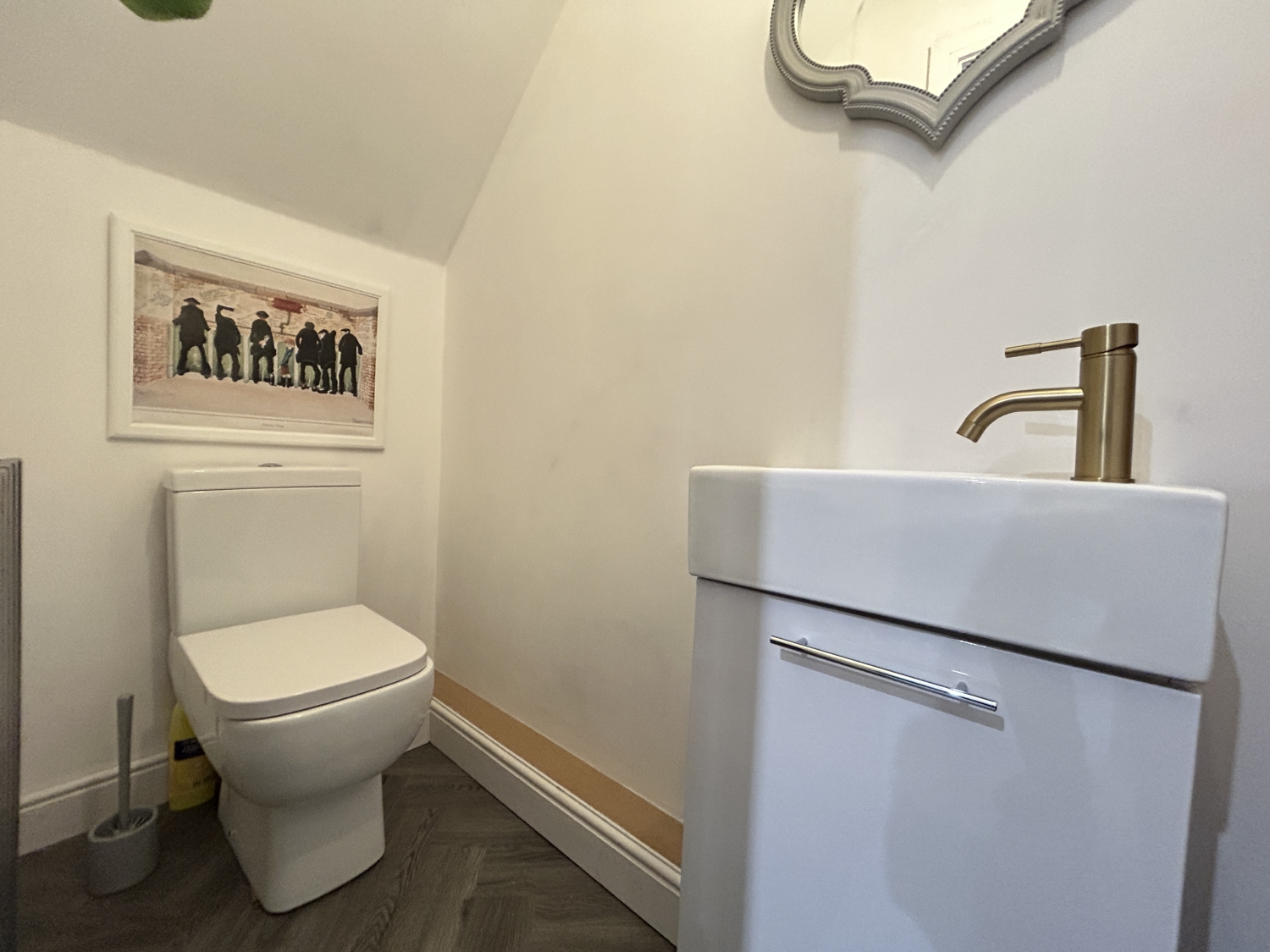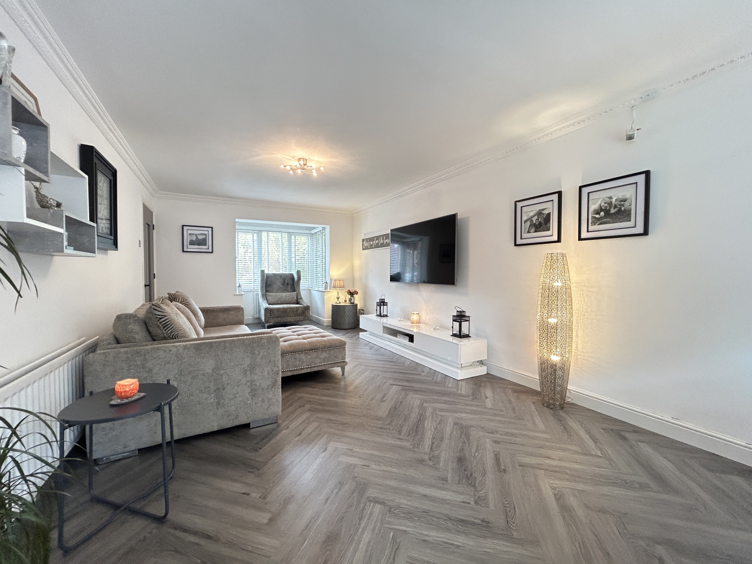 At the heart of the home is a stunning open plan kitchen and family space, recently refitted with a wide range of contemporary units, elegant quartz stone worktops, and a full complement of integrated appliances including oven, hob with extractor, fridge freezer, dishwasher, washing machine, and cleverly designed sliding bin storage. Bi-folding doors open directly onto the rear garden, while the kitchen flows seamlessly into a comfortable family seating area and also offers access to a convenient cloaks/WC – an ideal setting for relaxed everyday living.