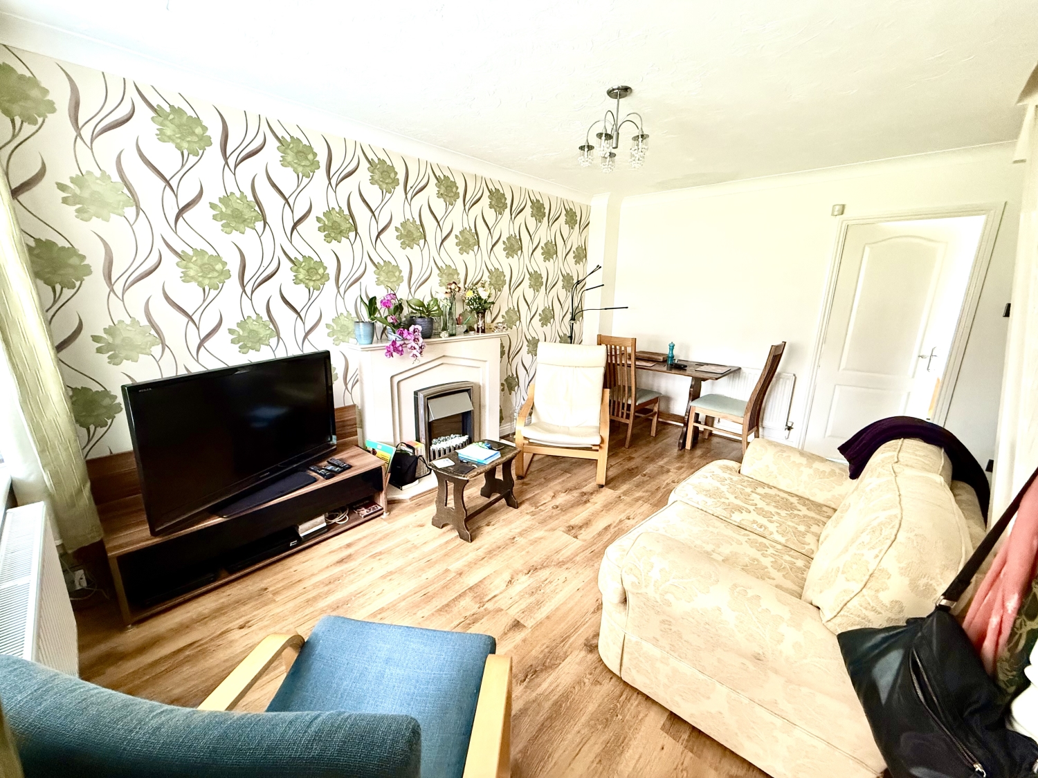 Double glazed UPVC bay window to the front, two central heating radiators, laminate flooring, coved and textured ceiling and spindle stairs to the first floor.