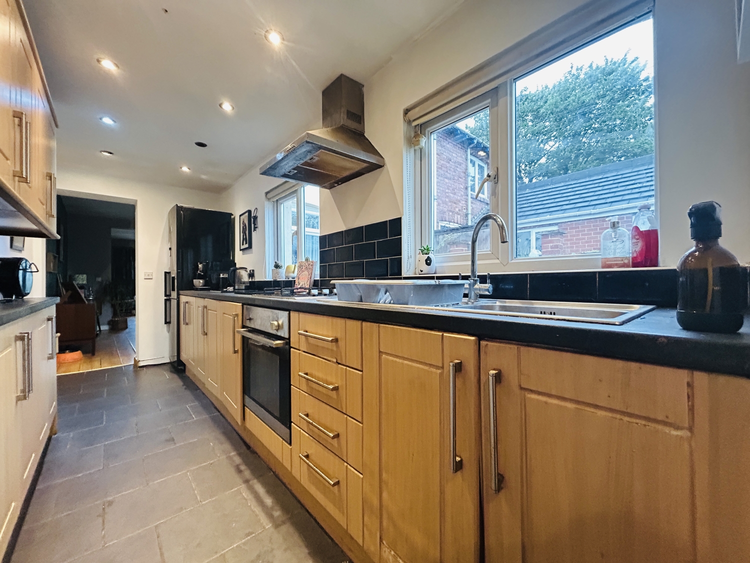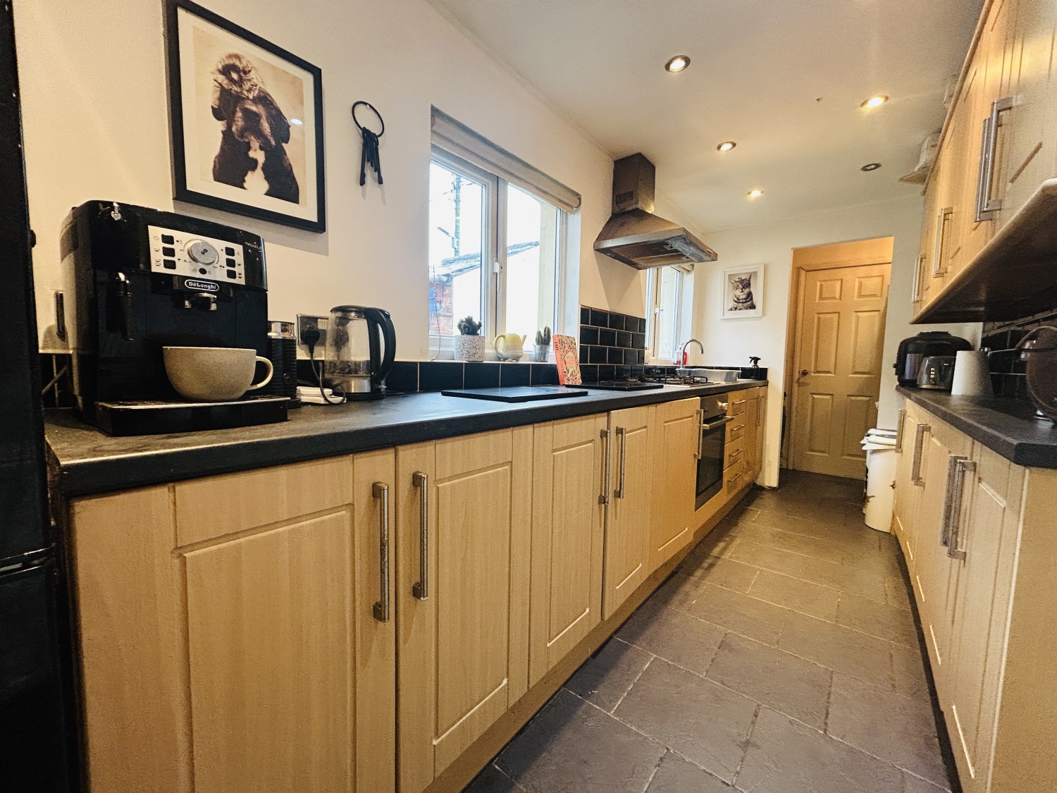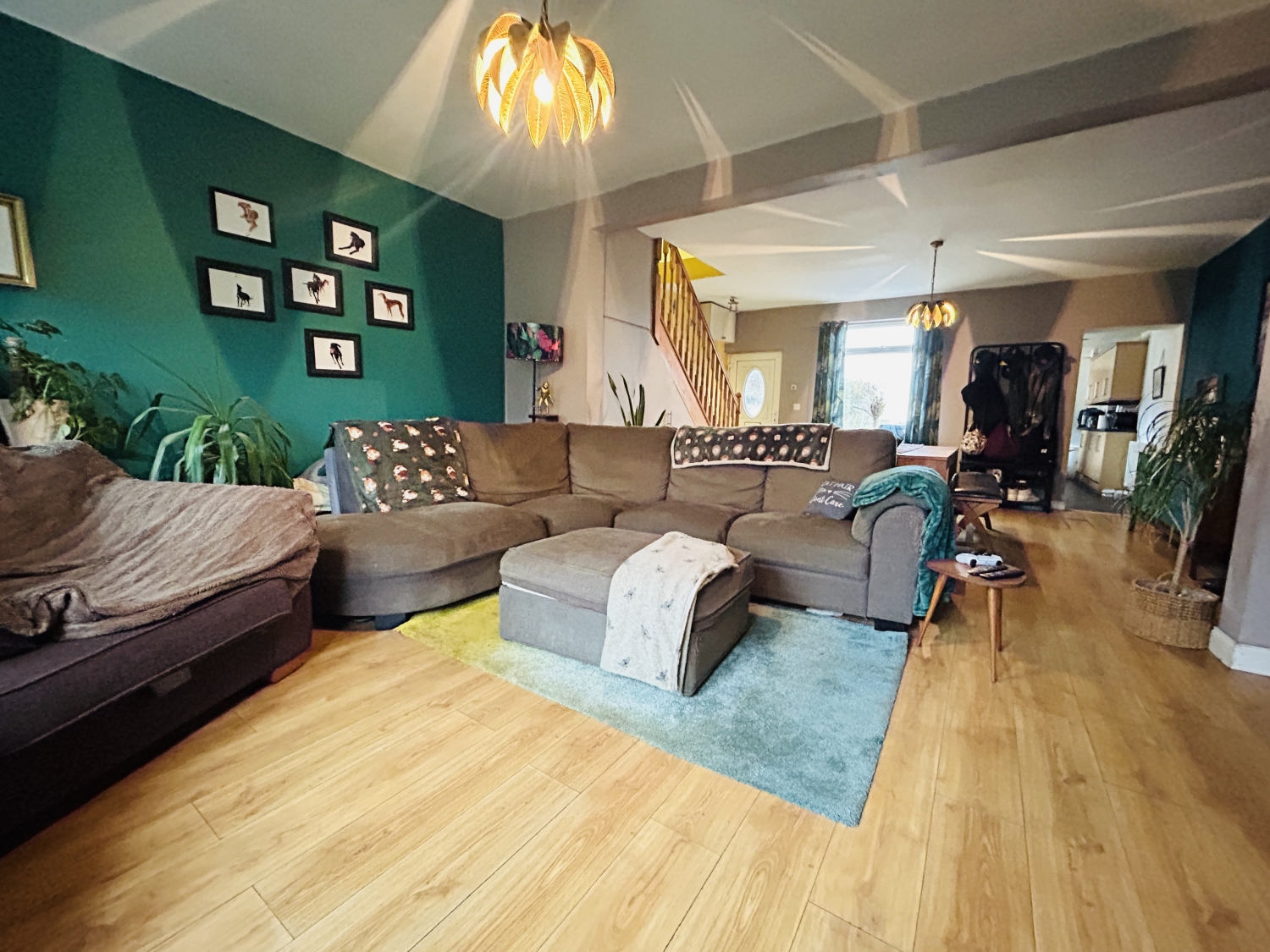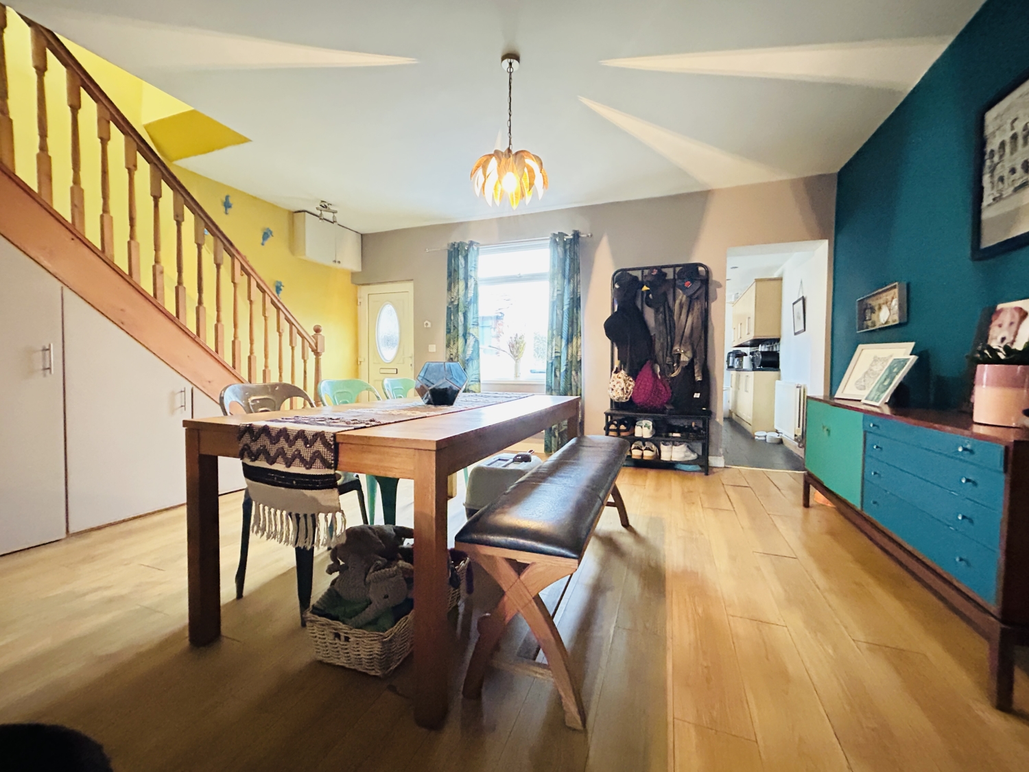 Offering excellent living space, the property features an enclosed front garden and rear parking. Inside, the generous dining room provides ample space for a large family table, with a spindle staircase, useful understairs storage, and an open archway leading to a well-proportioned living room. Here, a feature stove burner and patio doors create a warm and inviting space with access to the garden. The modern fitted kitchen offers plentiful storage and work surfaces, integrated oven and hob with extractor, and leads through to a utility area with a convenient ground floor cloaks/wc.