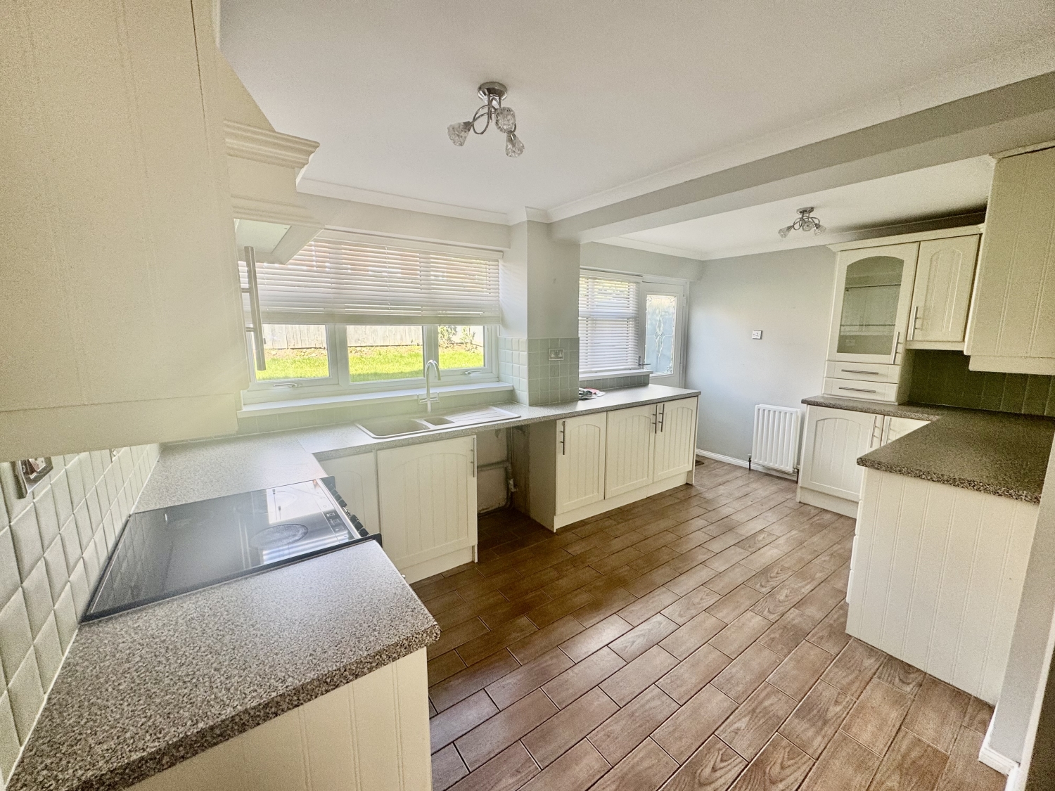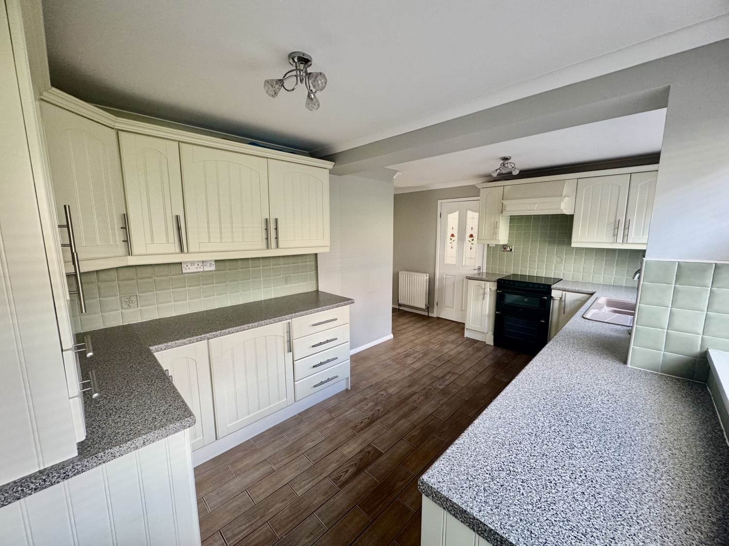 Fitted with a range of wall and base units finished with cream laminate heat resistant work surfaces, sink unit with mixer tap, extraction unit, plumbing for washing machine, two radiators, under stair storage cupboard, two UPVC framed double glazed windows and door with access to the rear garden.