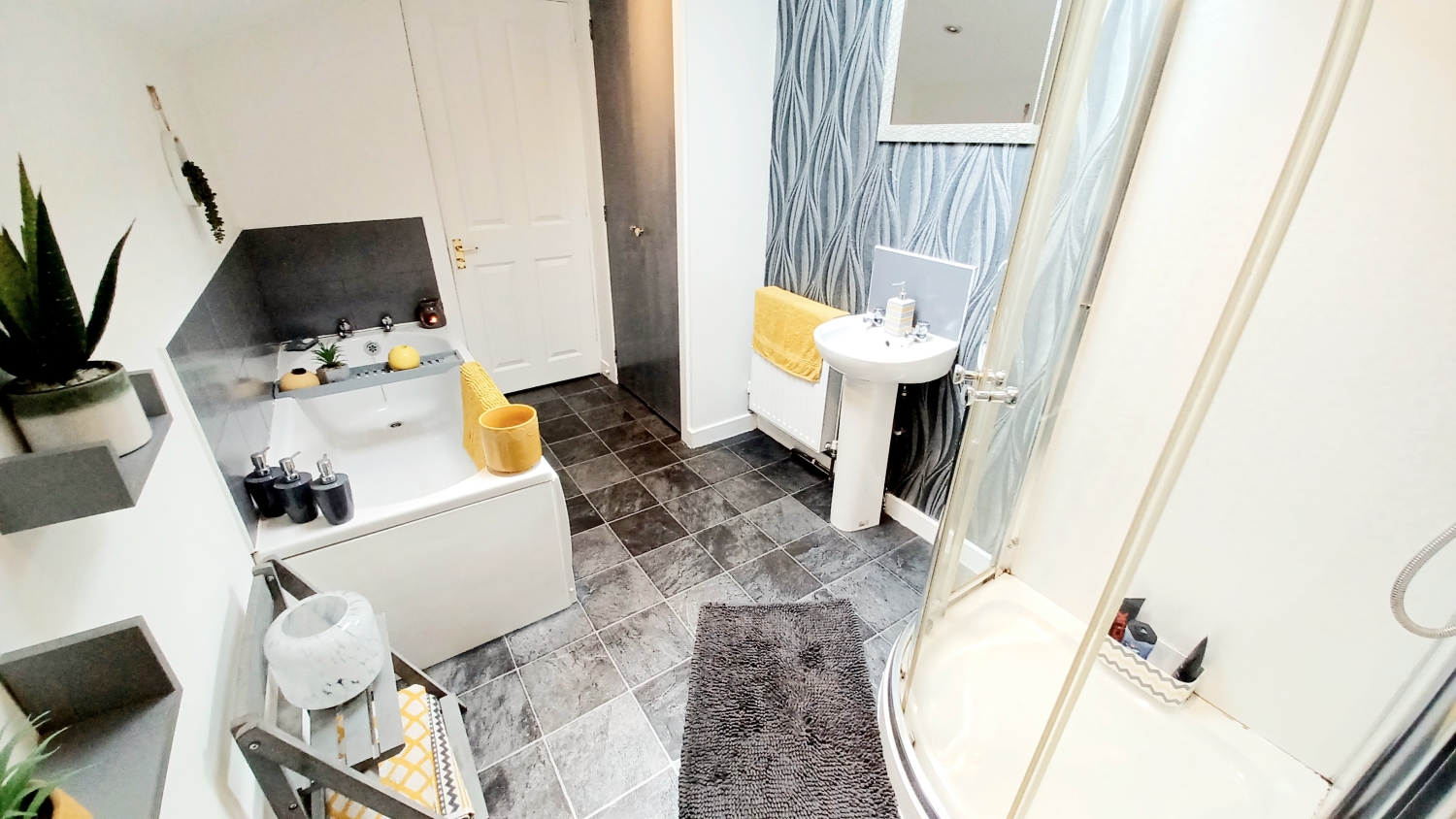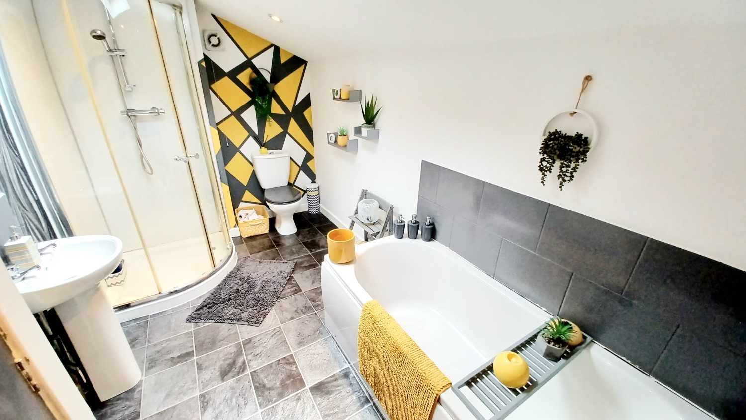 Bathroom – Stylish family bathroom featuring a modern four-piece suite, including bath, separate shower, WC, and wash hand basin.
