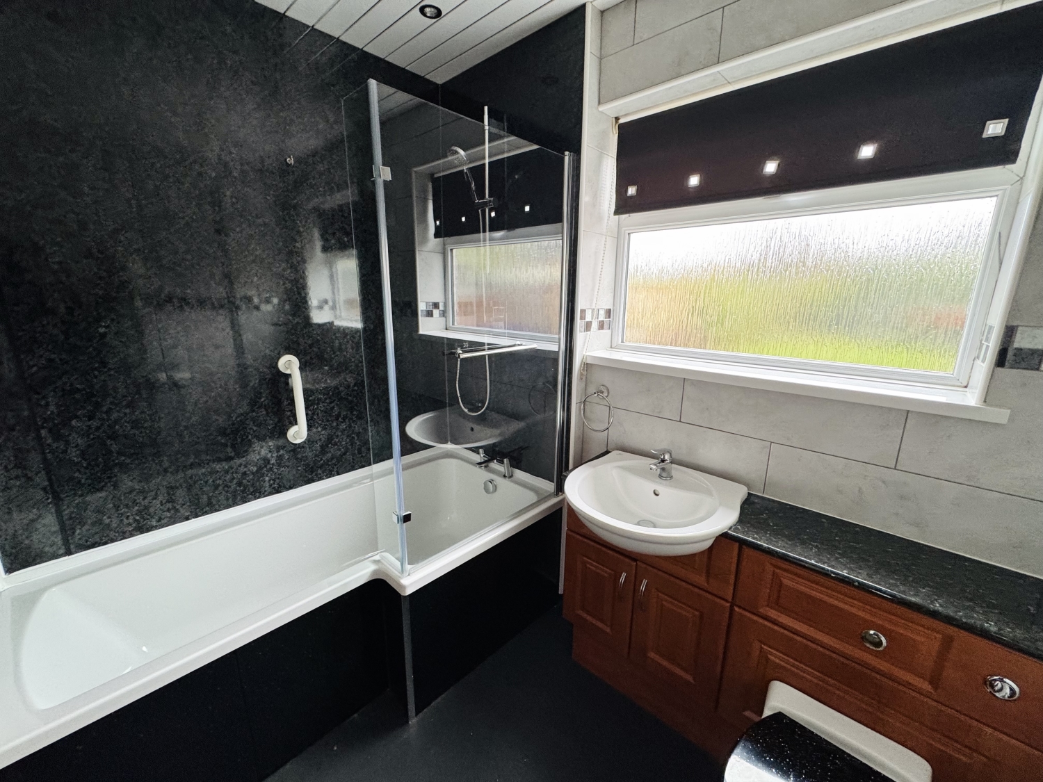 Fitted with a 3 piece suite comprising of; P shapes Bath with overhead shower, vanity wash hand basin, low level w/c, heated towel rail, part tiled walls, under floor heating, spotlights to ceiling, double glazed window to the rear elevation