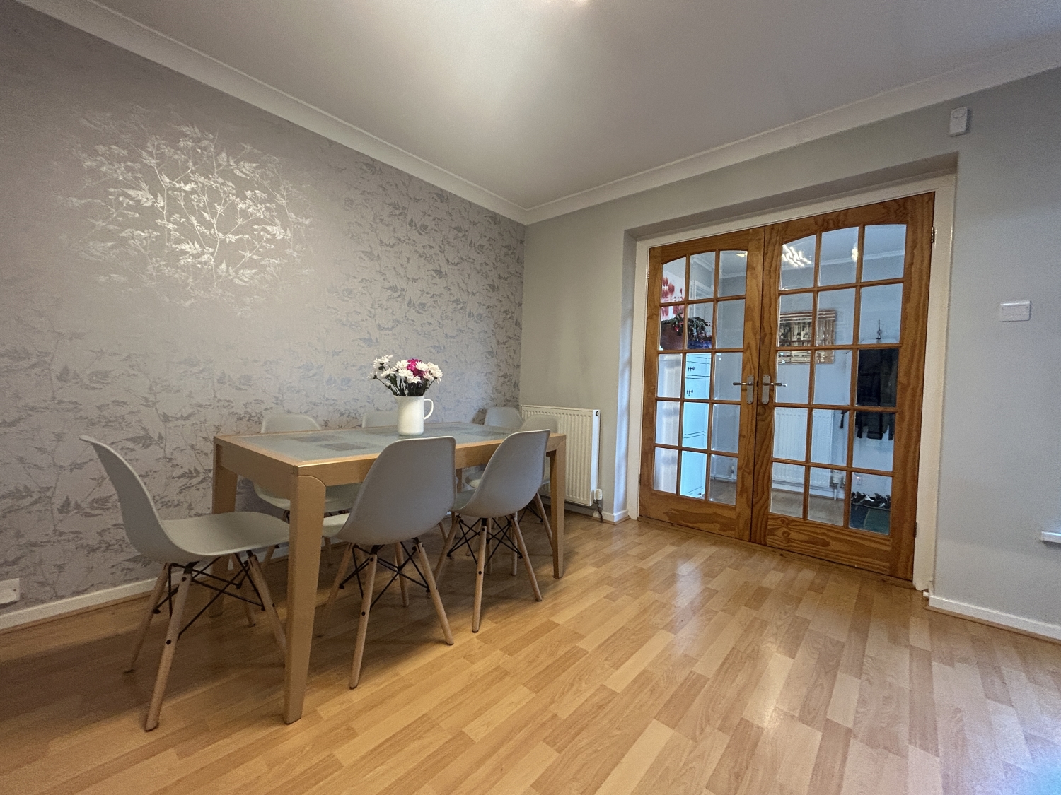 The welcoming entrance hall features a convenient cloakroom/WC and leads through elegant glazed French doors into a spacious dining room and a beautifully appointed living room. French doors open into a bright sun lounge that overlooks the landscaped rear garden, creating a seamless indoor-outdoor living experience.