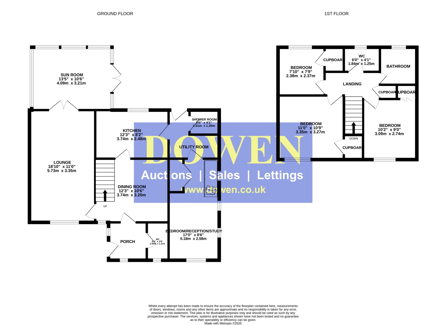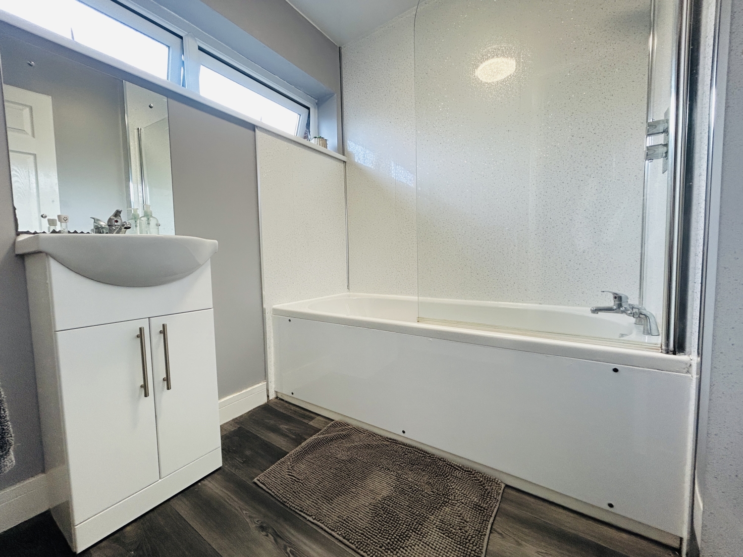 Upstairs, the first-floor landing leads to three well-sized bedrooms, two of which benefit from built-in storage. A family bathroom and a separate WC complete the upper level.