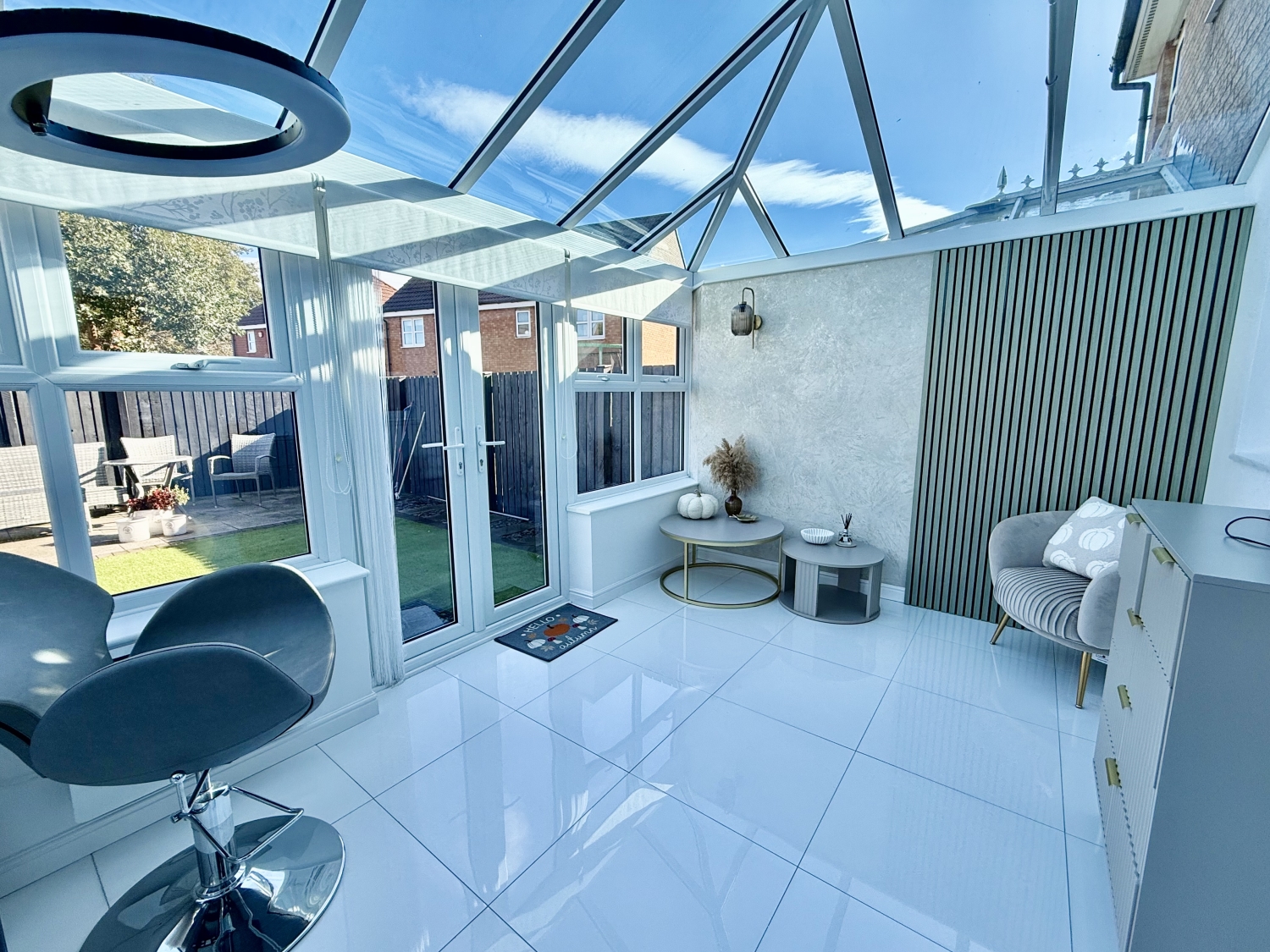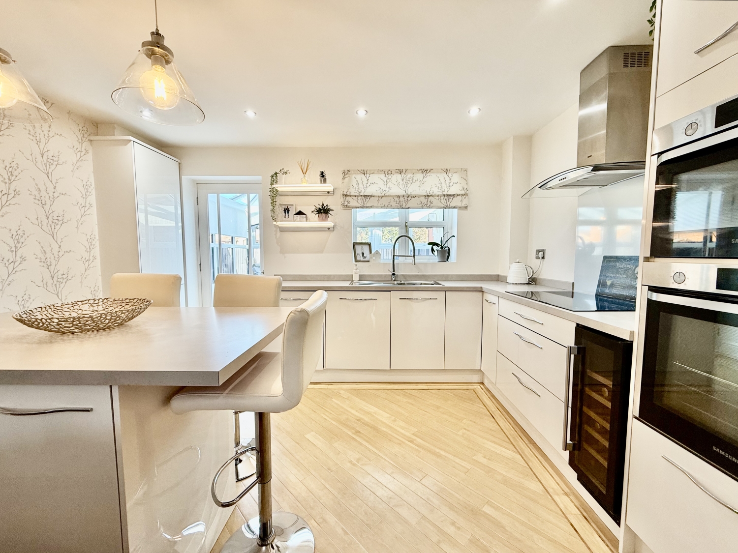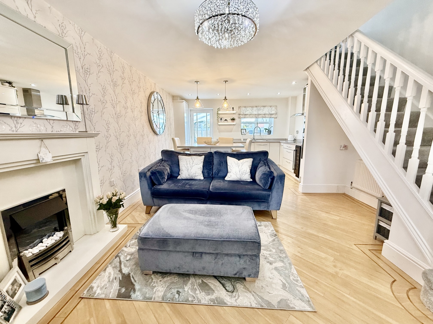 The ground floor features a spacious open-plan layout, ideal for entertaining and everyday living. A welcoming entrance vestibule leads to a convenient cloakroom/WC. The lounge area is bright and inviting, complete with a feature fire surround, electric fire, and staircase to the first floor. The upgraded kitchen boasts sleek high-gloss units, integrated appliances, a matching island, and a breakfast bar—perfect for casual dining or hosting guests. A standout feature is the garden room extension, with a glass roof that floods the space with natural light, currently used as an additional sitting room.