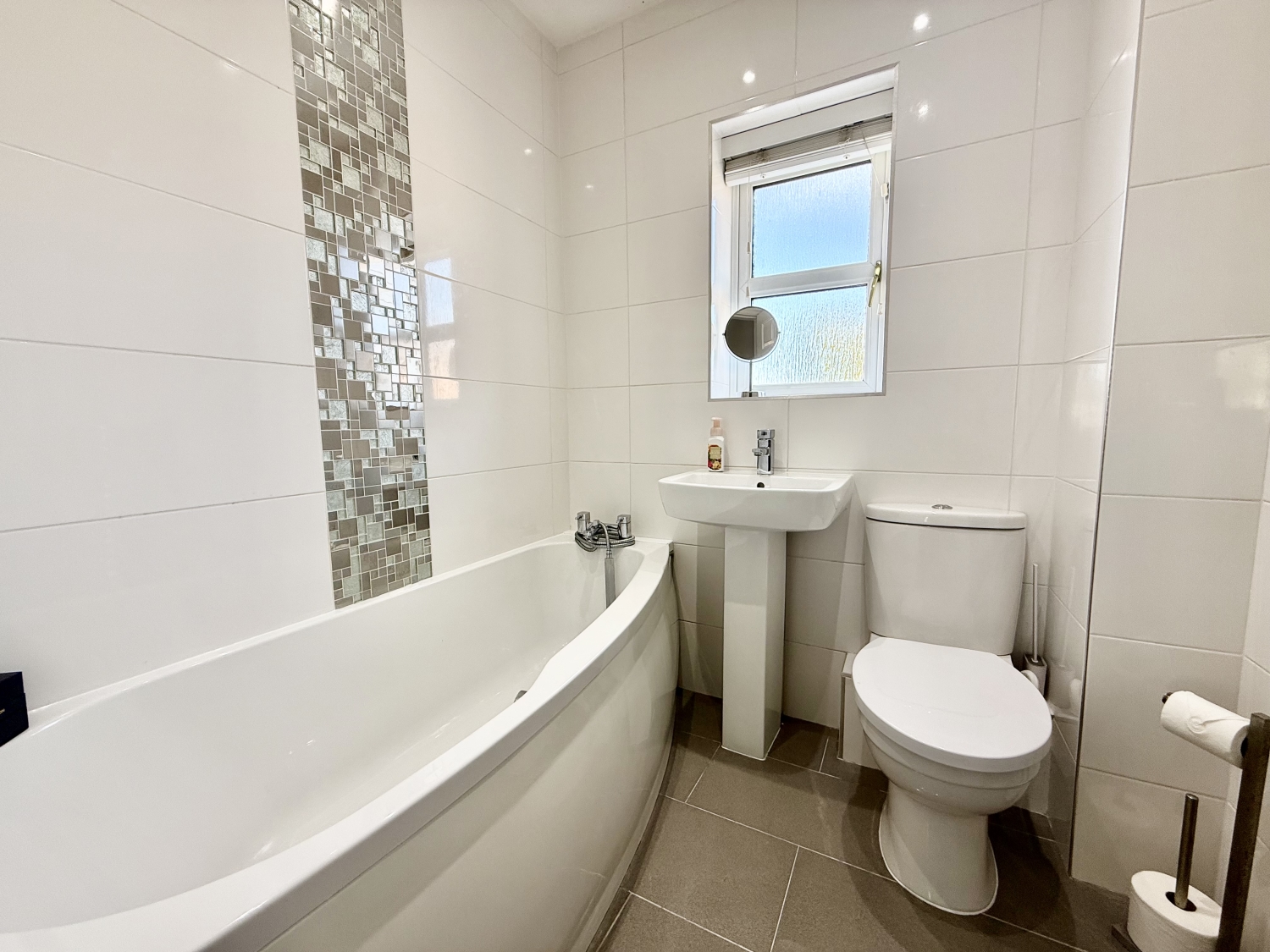 Upstairs, the property offers two well-proportioned bedrooms, including a master bedroom with a built-in double wardrobe. They are served by a modern refitted bathroom, featuring a stylish three-piece white suite with chrome fittings.