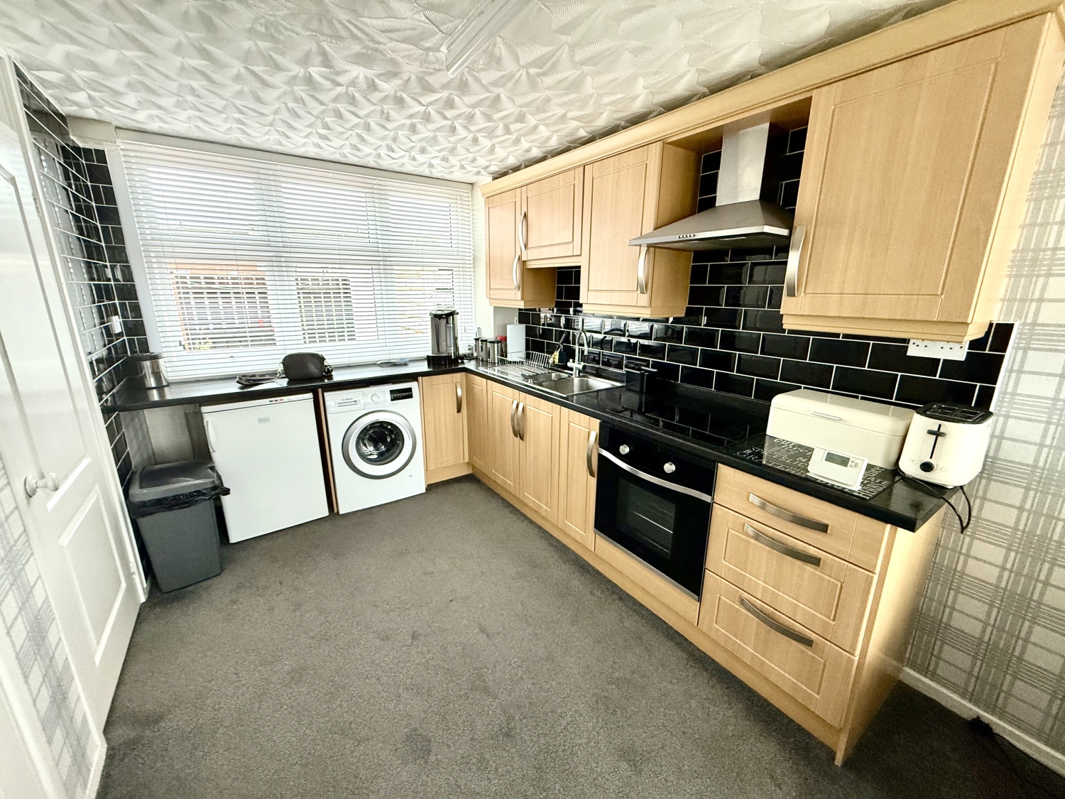 Fitted with an excellent range of wall and base units having contrasting work surfaces, incorporating a stainless steel sink unit incorporating a stainless steel sink unit with mixer tap and drainer. Eye catching splashback tiling, built in oven, hob and stainless steel extractor hood, plumbing for an automatic washing machine, double glazed windows to the front and also to the rear and central heating radiator.