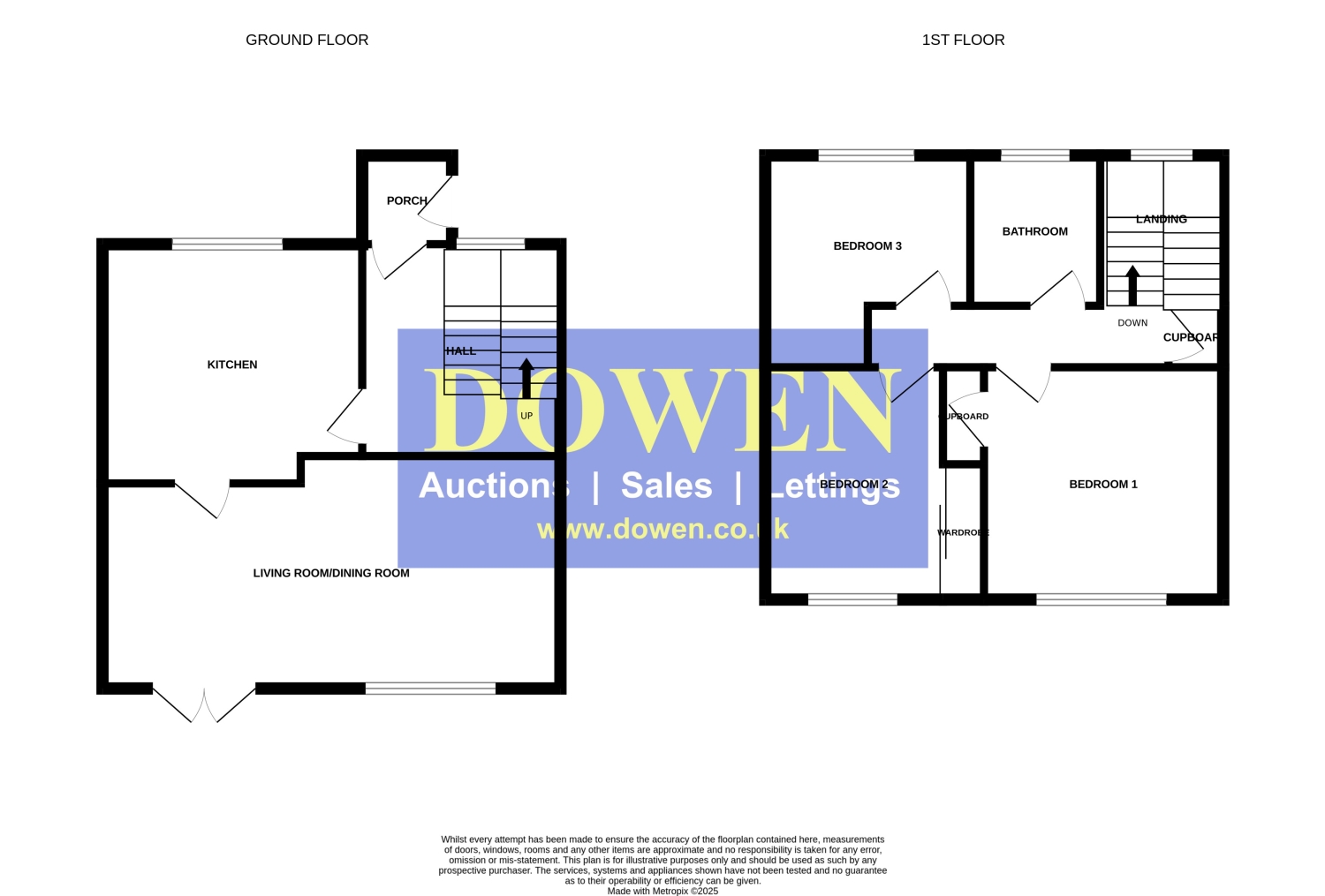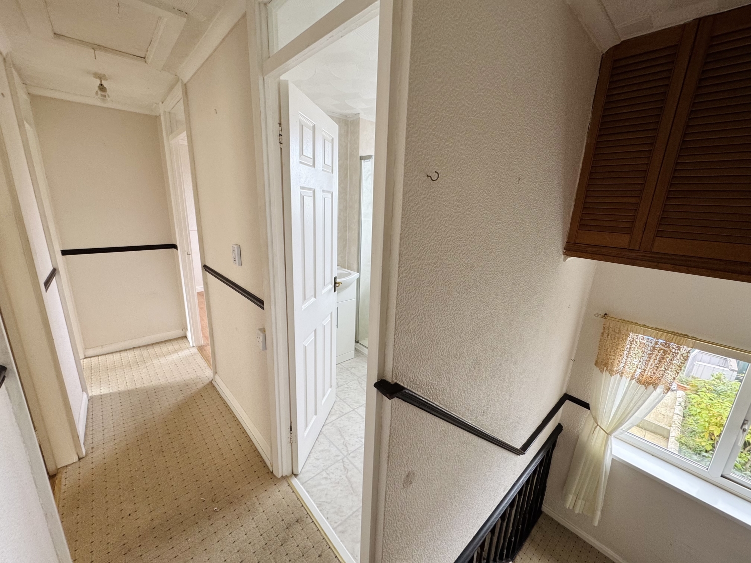 Upstairs, the landing provides access to three bedrooms, each equipped with built-in or fitted wardrobes, ensuring ample storage and convenience. The family bathroom is fitted with a double shower, offering a practical and efficient bathing solution.