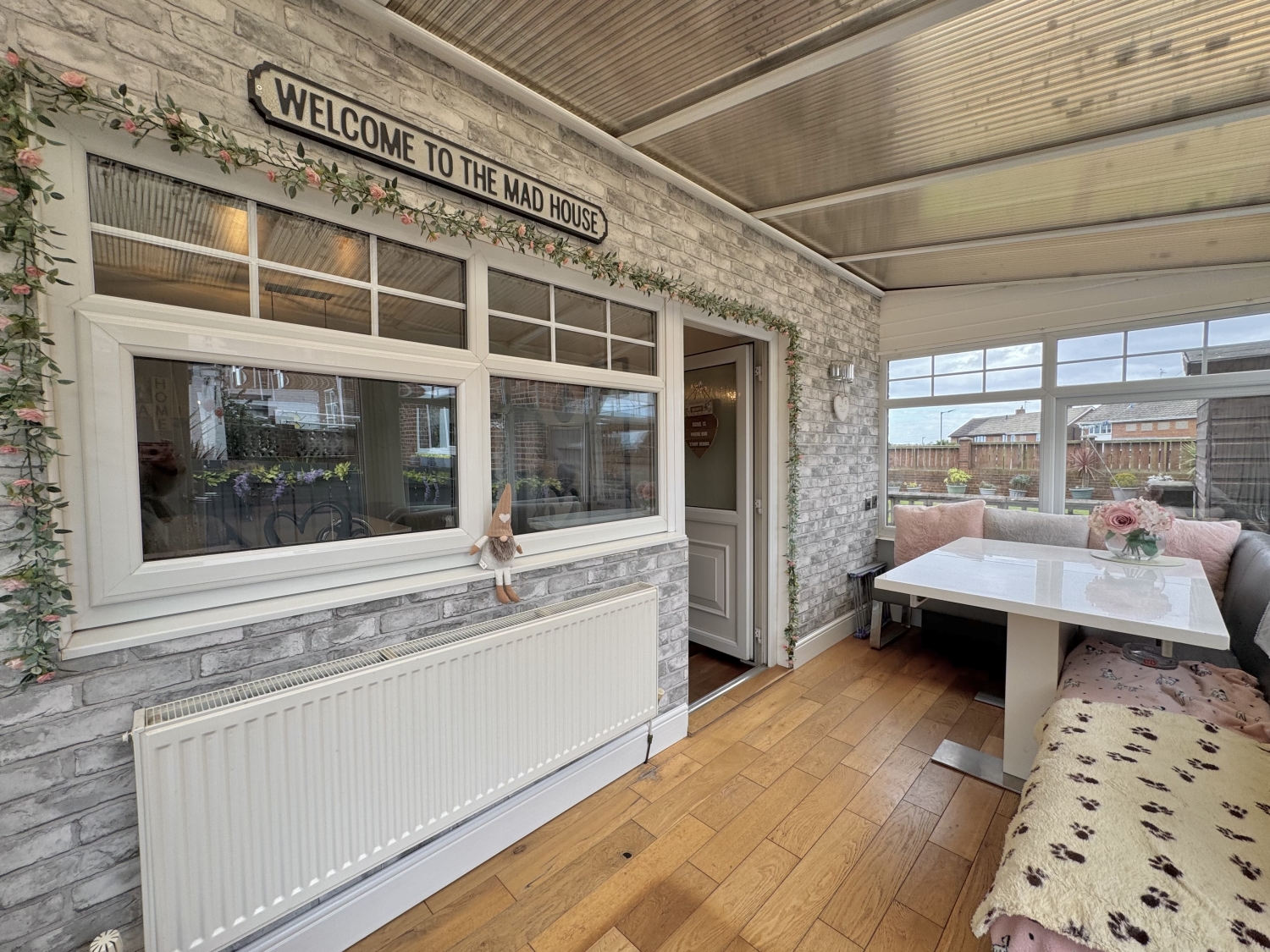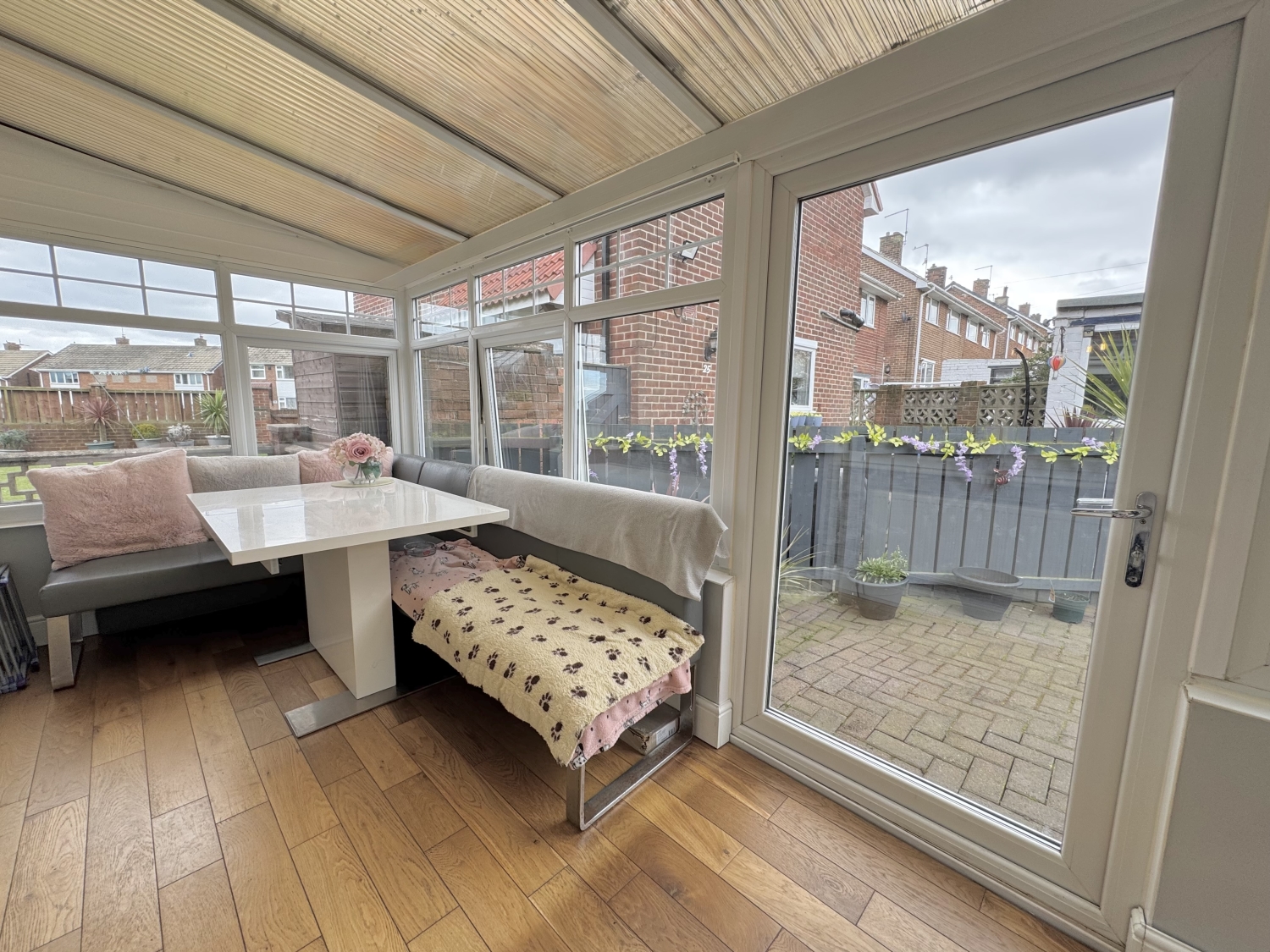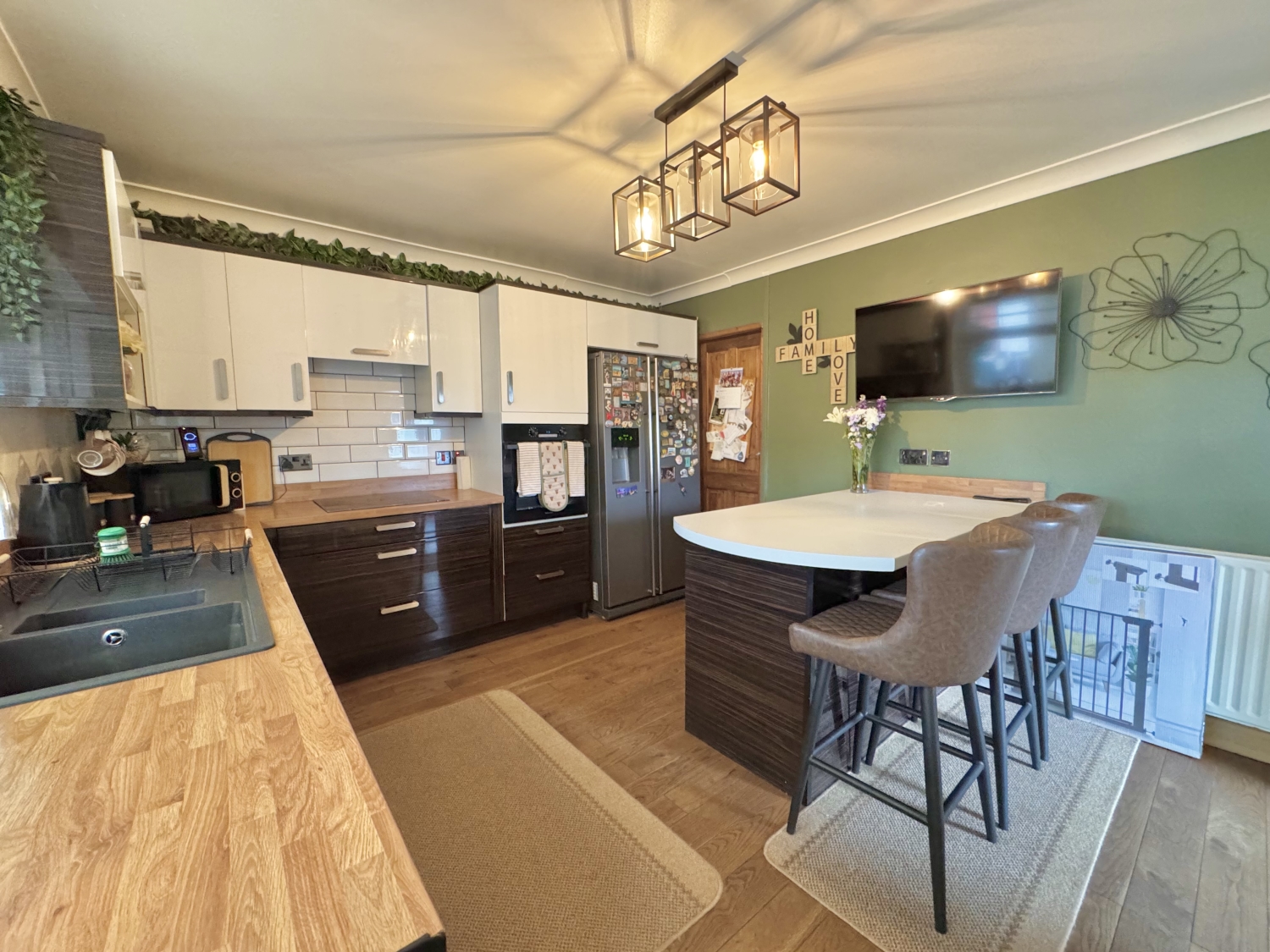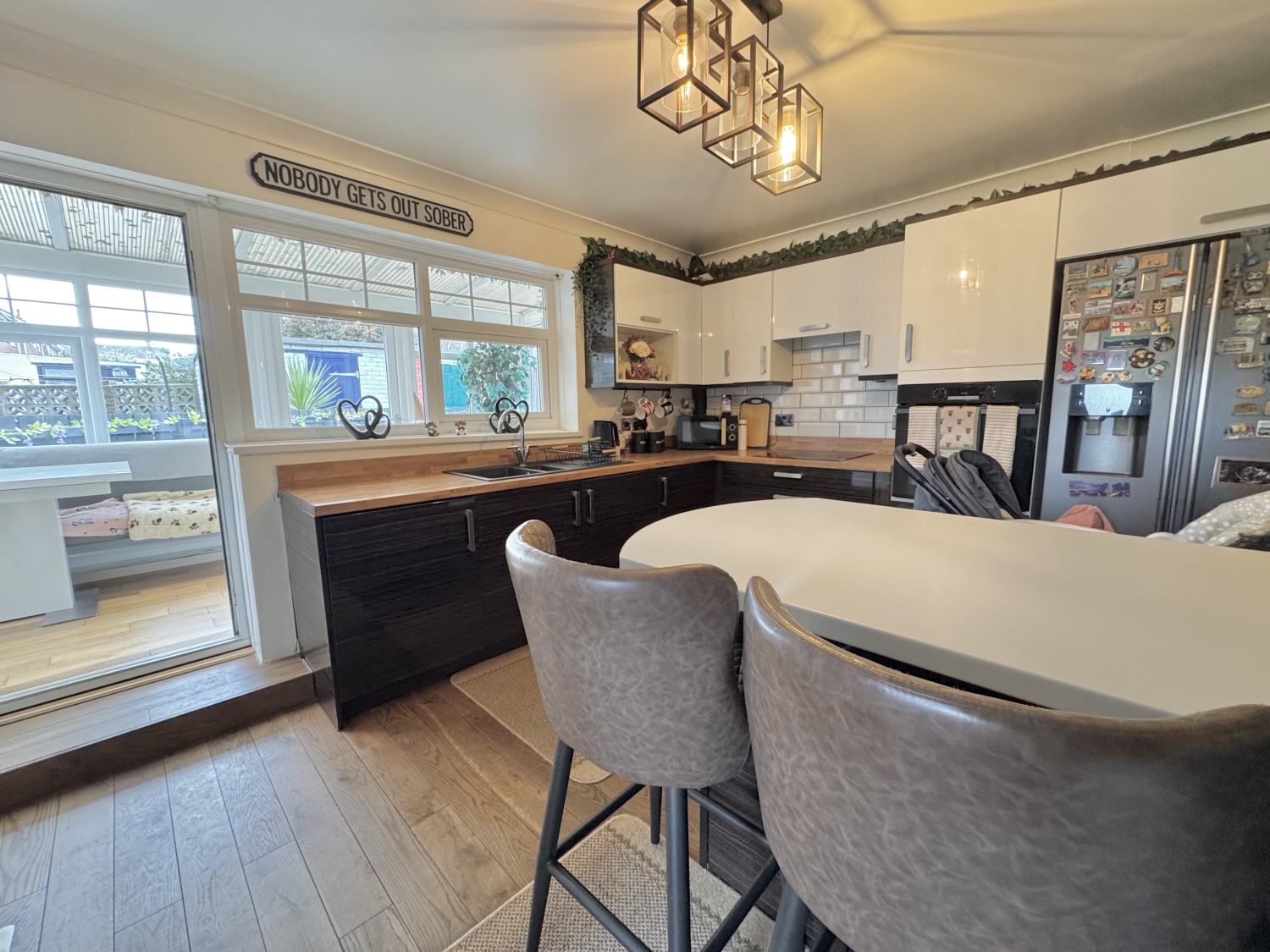 The entrance hall leads into a bright and welcoming lounge, enhanced by UPVC double‑glazed sliding doors opening onto the rear garden. A charming multi‑fuel fire creates a cosy focal point, making this a lovely space to relax. The ground floor also benefits from a convenient shower room. To the rear sits a generous kitchen/diner fitted with a range of wall and base units, complemented by a central kitchen island providing additional workspace and seating. From here, step into the sunny conservatory, complete with double doors leading out to the garden—ideal for entertaining or enjoying the natural light.