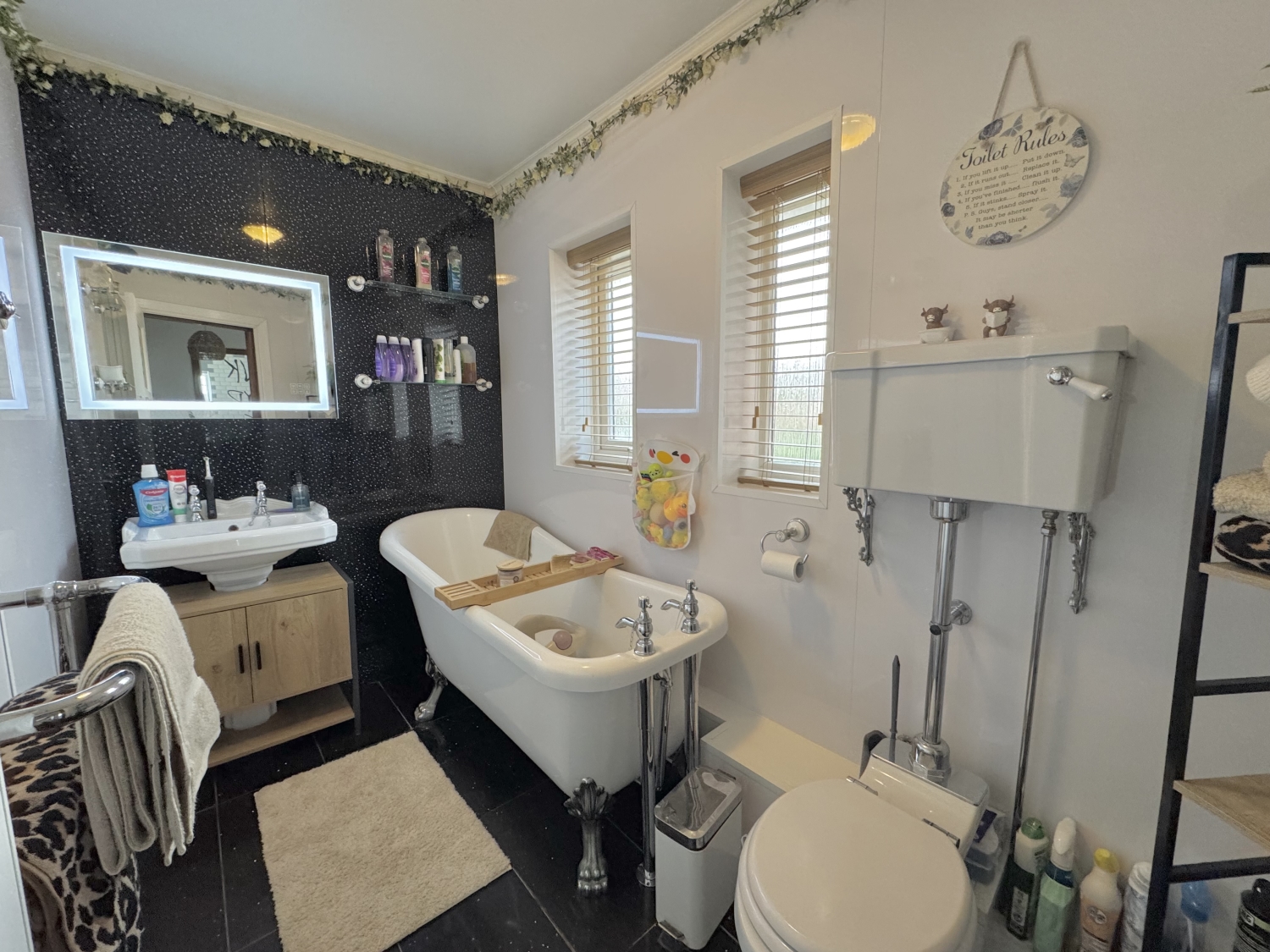 To the first floor, you will find two well‑proportioned double bedrooms and a comfortable single bedroom. The stylish family bathroom features a freestanding decorative bath, adding a touch of luxury to the home.