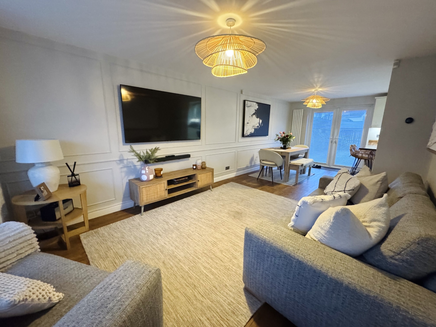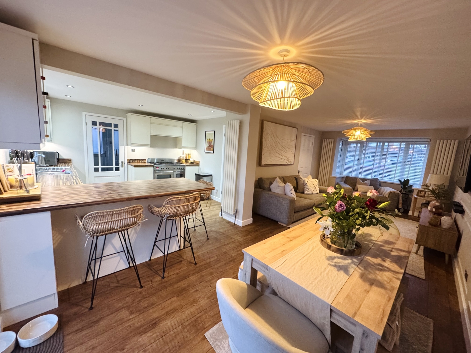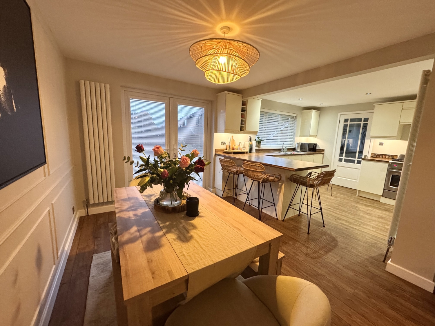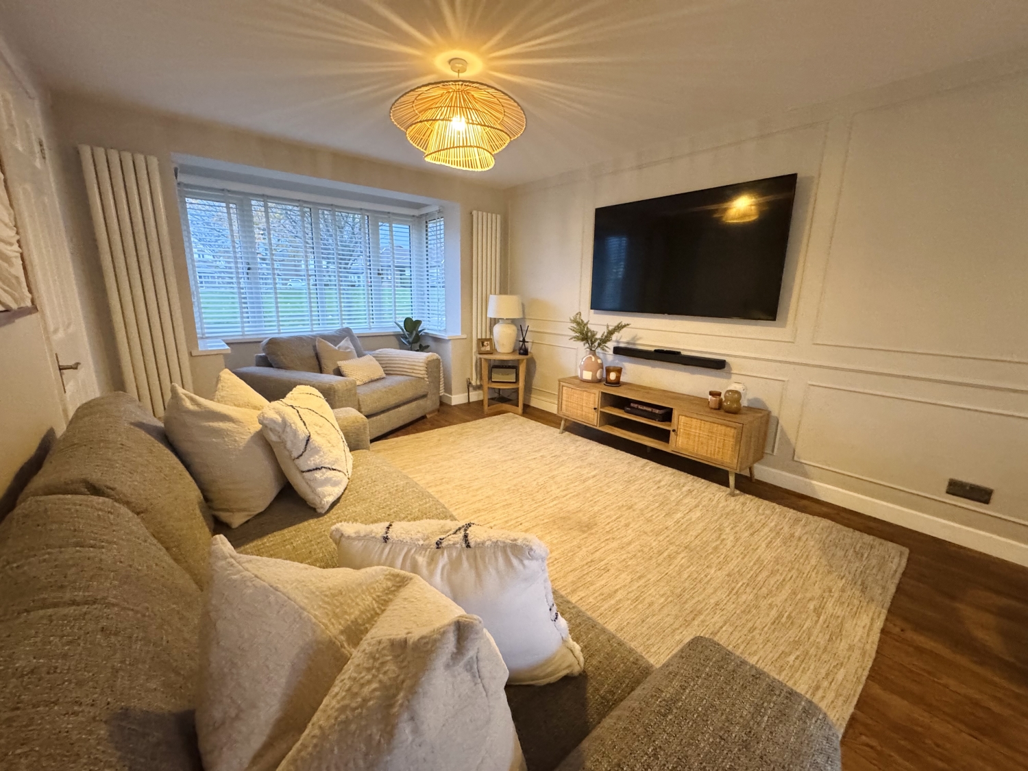 The heart of the property is the impressive 19ft kitchen/dining room, fitted with a range of wall and base units, a breakfast bar, appliances including a Rangemaster cooker. Patio doors open out to the rear garden, creating a seamless indoor-outdoor flow perfect for entertaining. The kitchen also opens into the living room, which features a double-glazed bay window to the front elevation and decorative wall panelling, offering a warm and welcoming space to relax.
