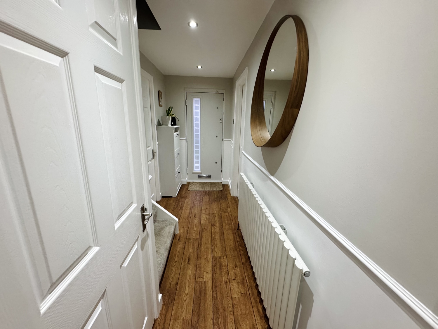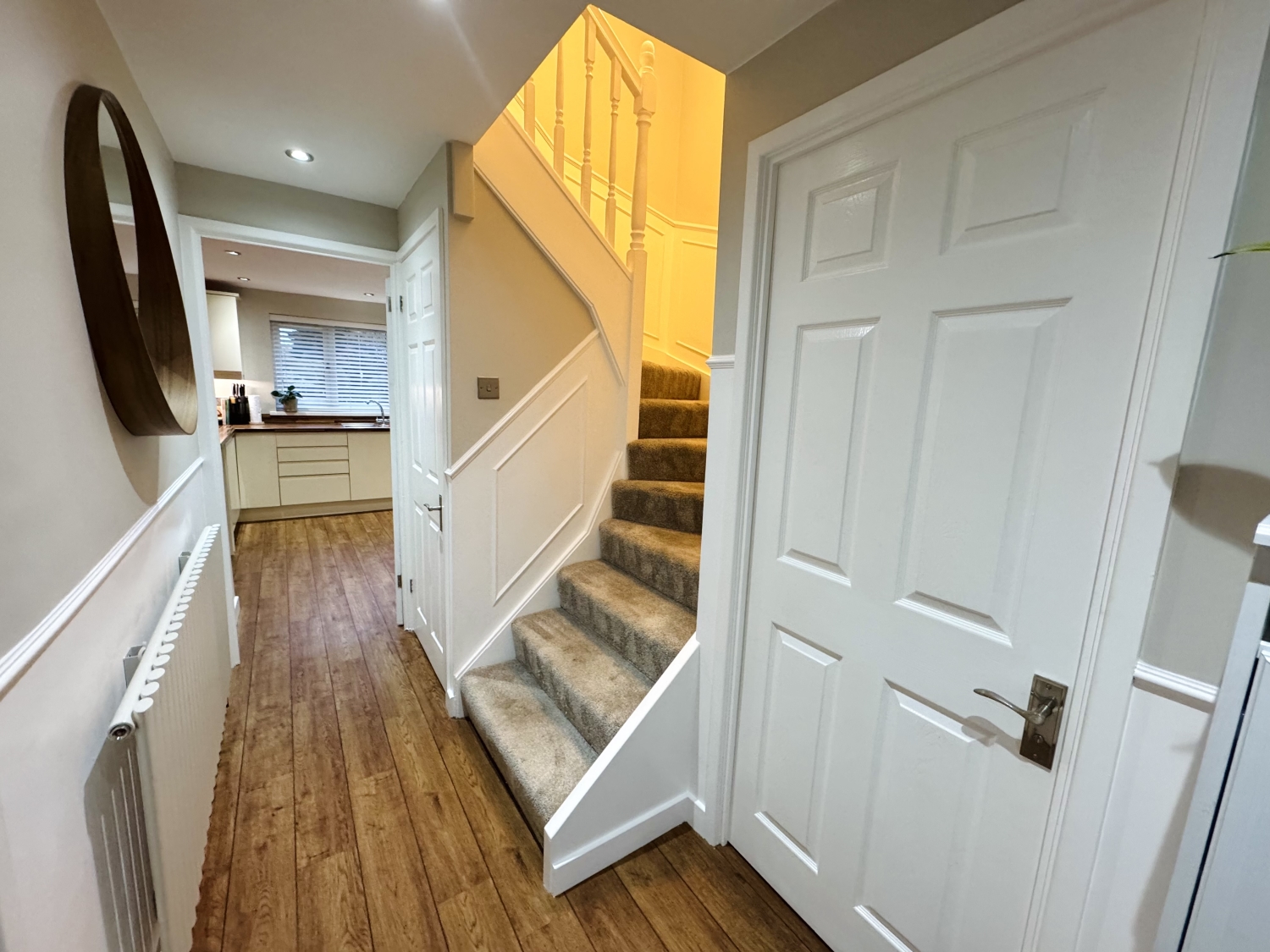 Composite door, feature panelling to walls, storage cupboard, radiator, stairs leading to the first floor landing