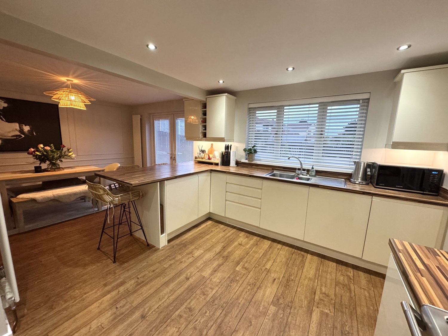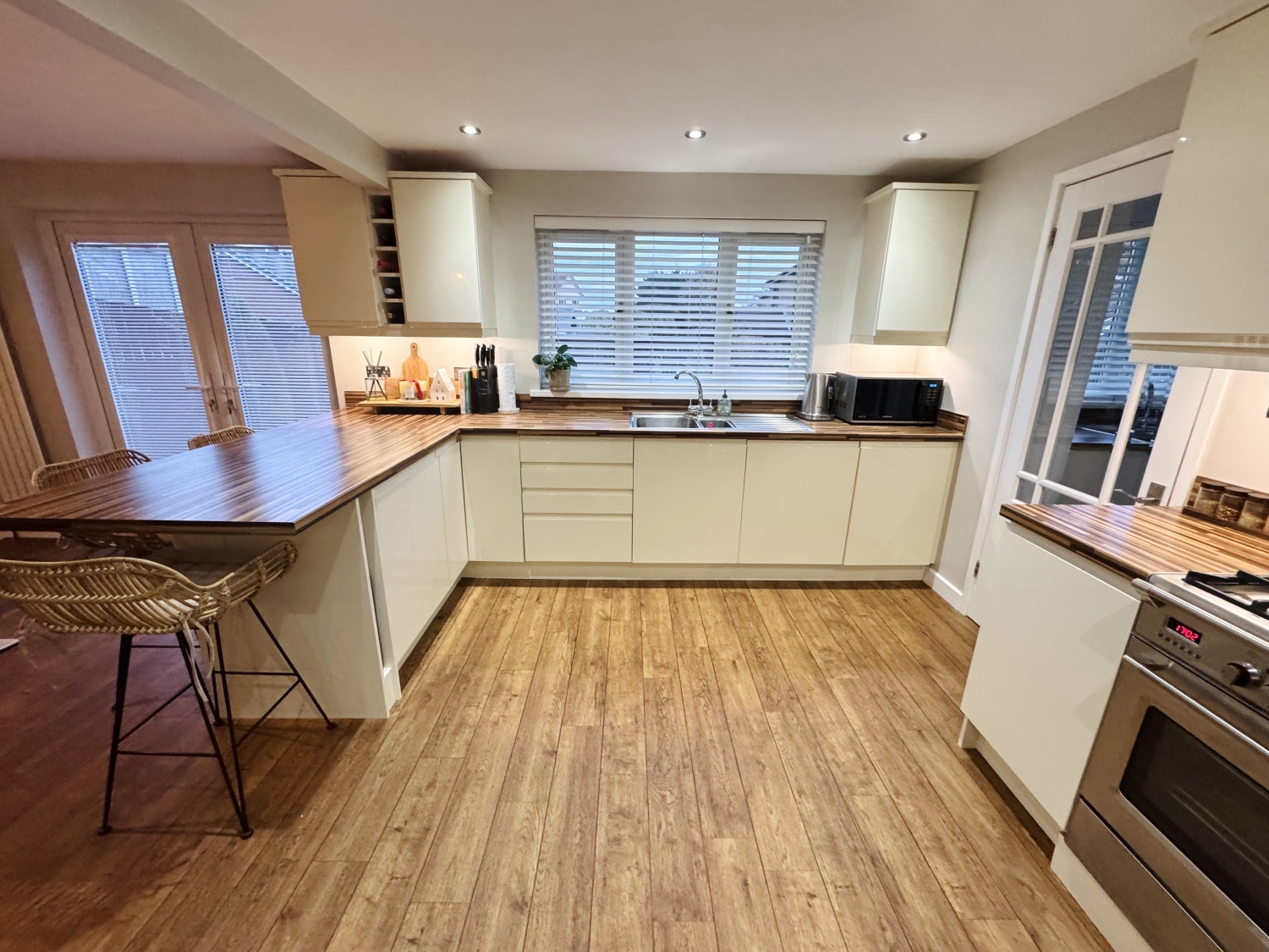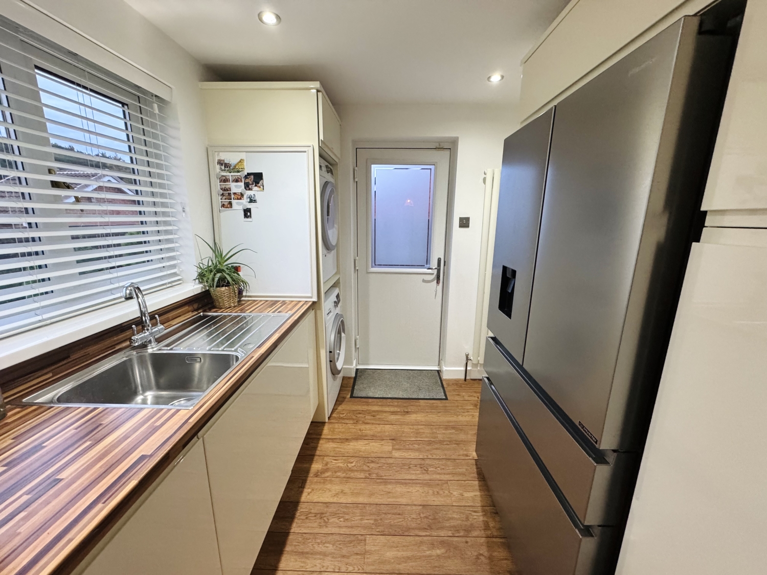 Fitted with base units with complementing work surfaces and splash backs, stainless steel sink with drainer and mixer tap, space for fridge/freezer, space for washing machine, space for dryer, vertical radiator, spotlights to ceiling, integral door into the double garage, composite door to the rear garden