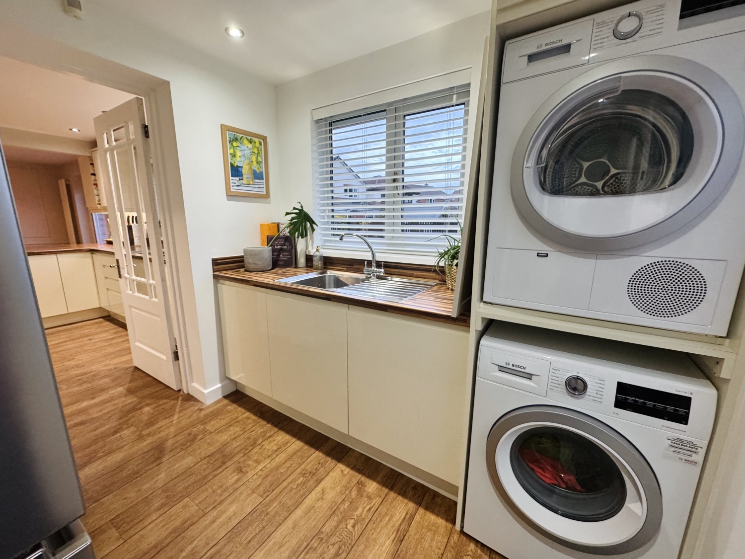 From the kitchen, a door leads into the utility room, which provides ample space for a washer, dryer, and fridge/freezer. A composite door gives access to the rear garden, while an internal door connects directly to the double garage.