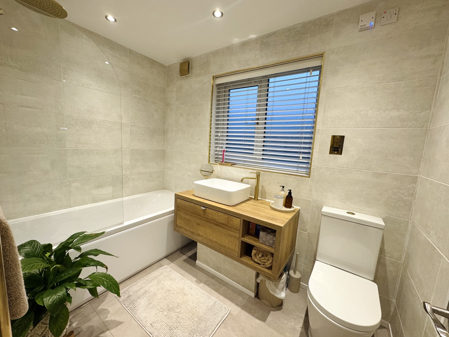 Fitted with a 3 piece suite comprising of; Bath with overhead shower, vanity wash hand basin, low level w/c, heated towel rail, shaver socket, tiled walls, spotlights to ceiling, extractor fan, double glazed window to the front elevation