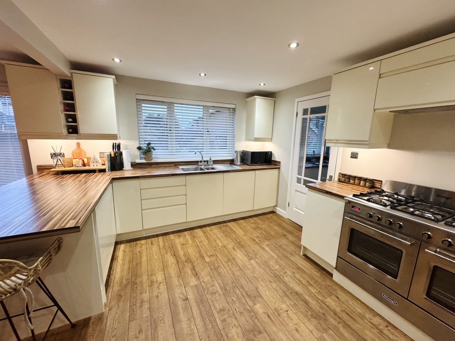 Fitted with a range of wall and base units with complementing work surfaces, breakfast bar and splash backs, Rangemaster cooker with 5 ring gas hob, double electric oven and warming tray, extractor hood, stainless steel sink with drainer and mixer tap, integrated dishwasher, two vertical radiators, spotlights to ceiling, double glazed window to the rear elevation, patio doors to the rear garden, opening into the living room