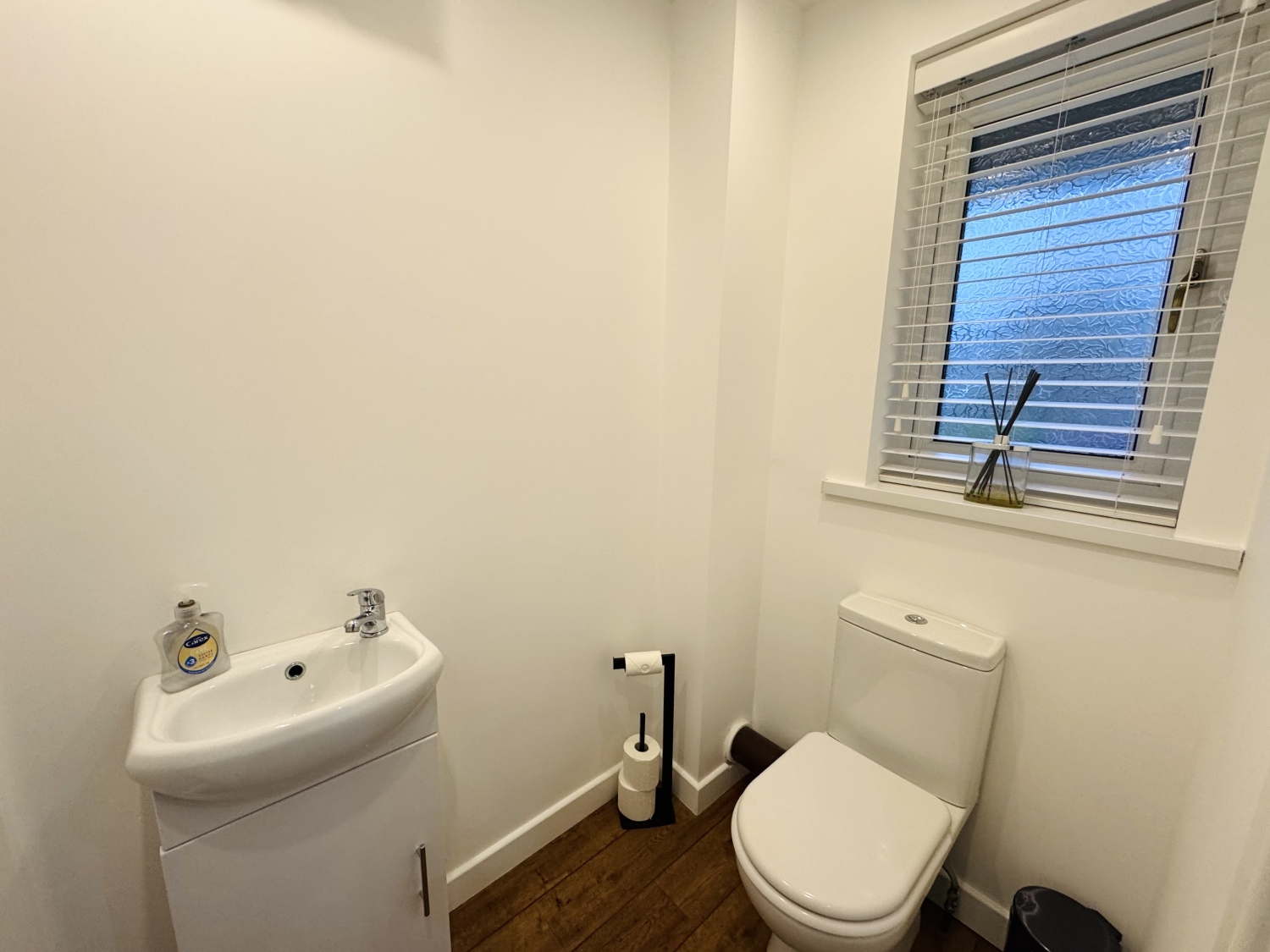 Low level w/c, wash hand basin, spotlights to ceiling, radiator, double glazed window to the front elevation