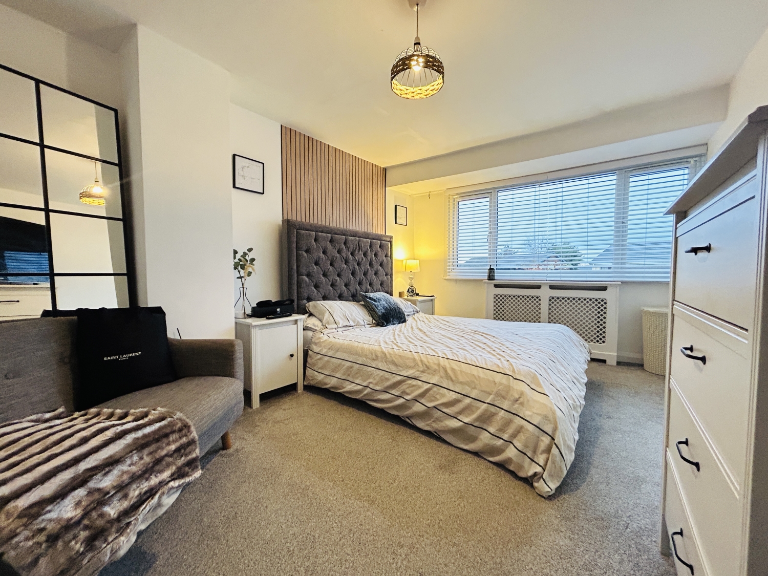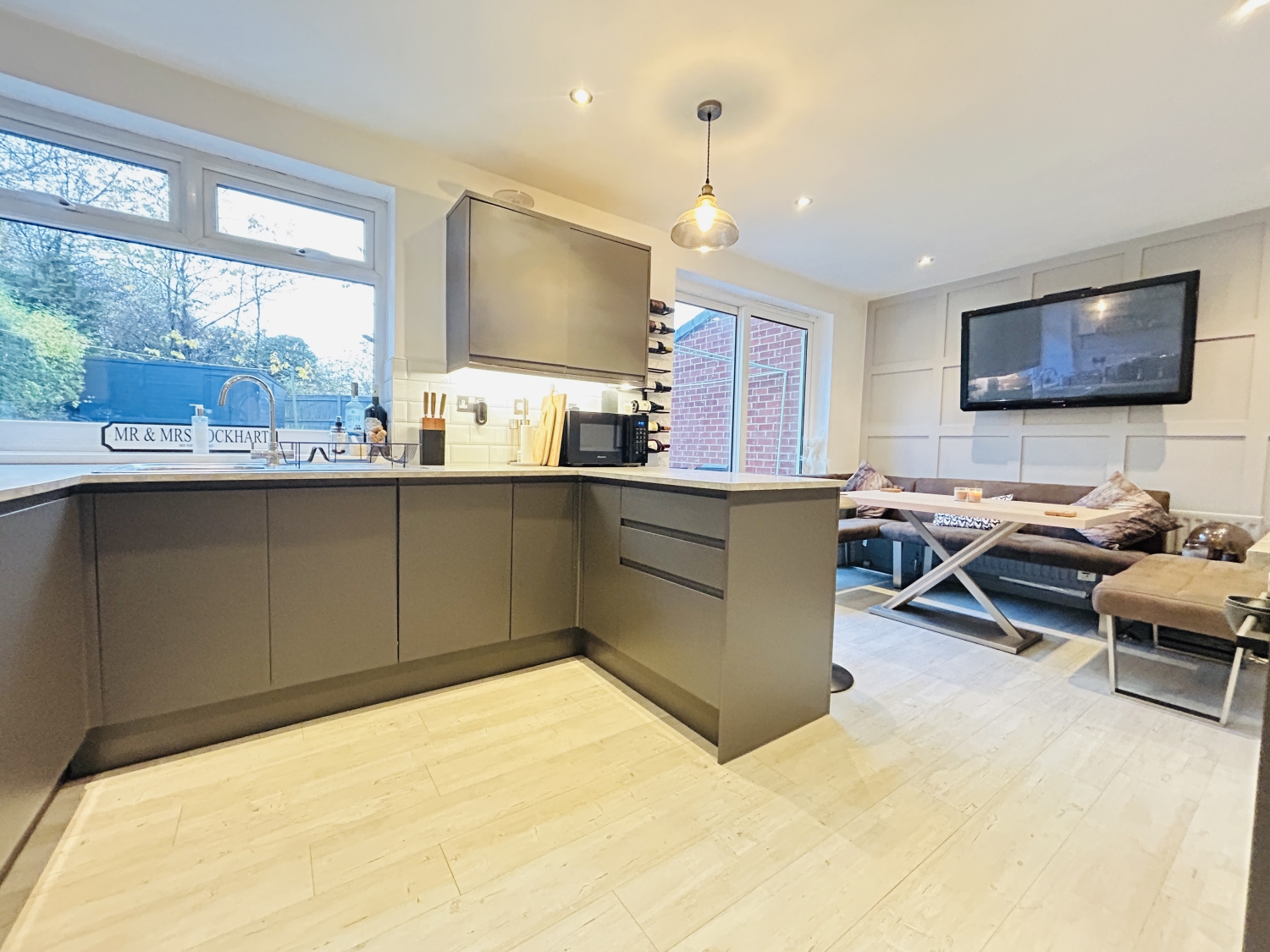 Offering generous accommodation throughout, the home features three well-sized bedrooms, a beautifully refitted modern open-plan kitchen and dining room, and a luxurious family bathroom with WC. There is also a utility area and a convenient ground-floor shower room/WC. The garage has been converted to provide a fourth bedroom or an additional reception room, offering flexibility for family living or home working.