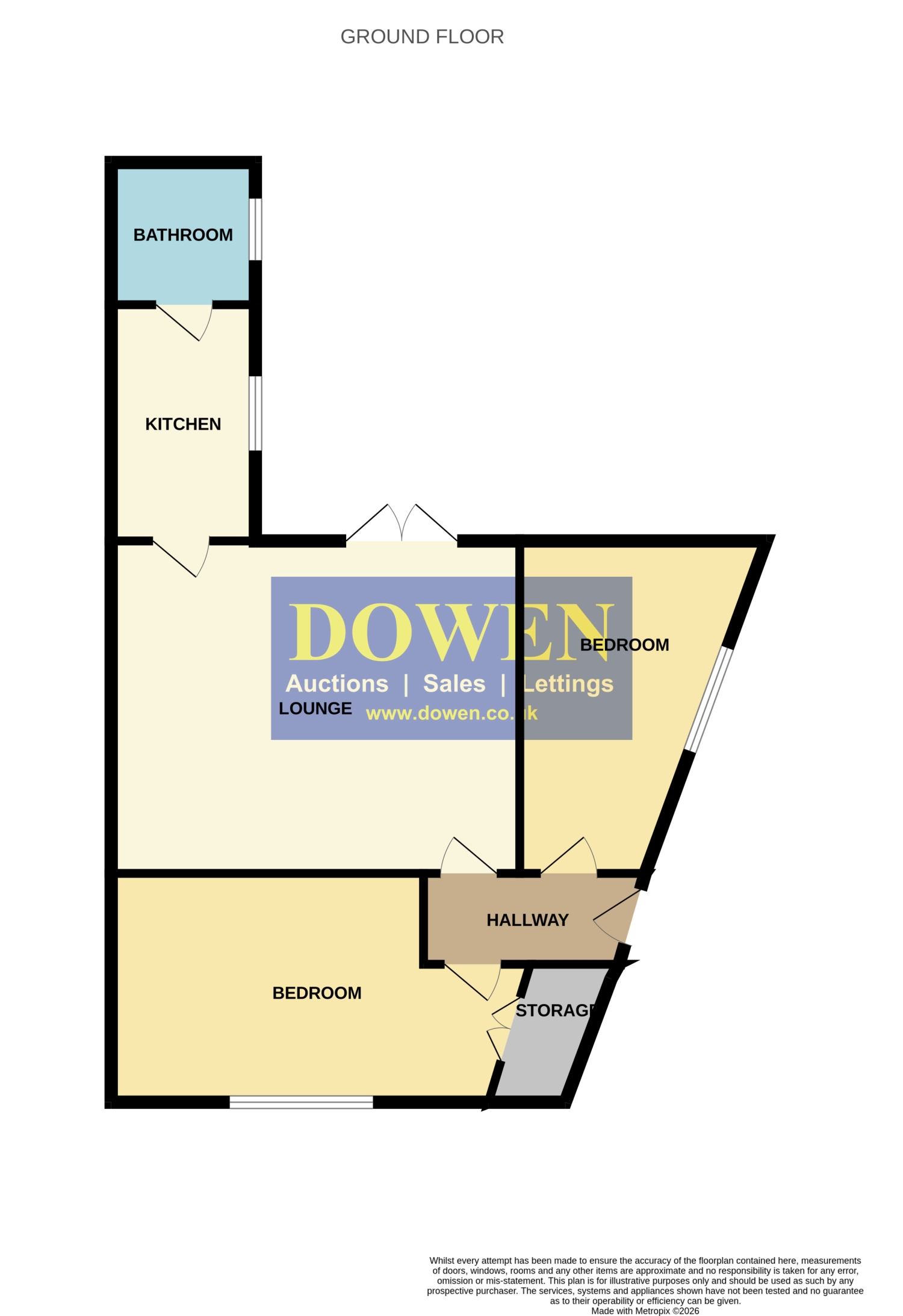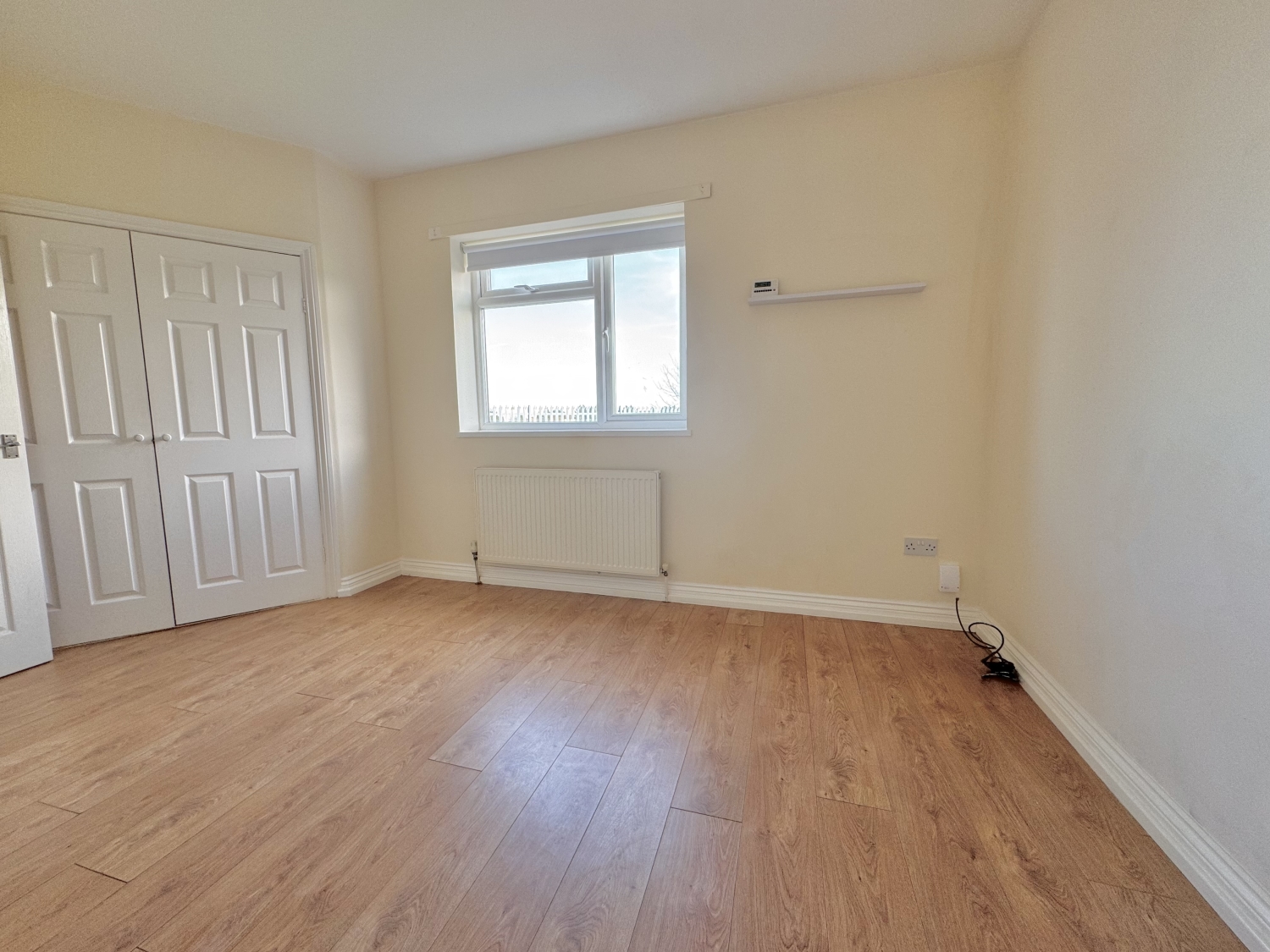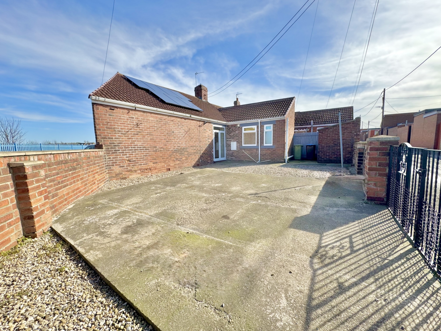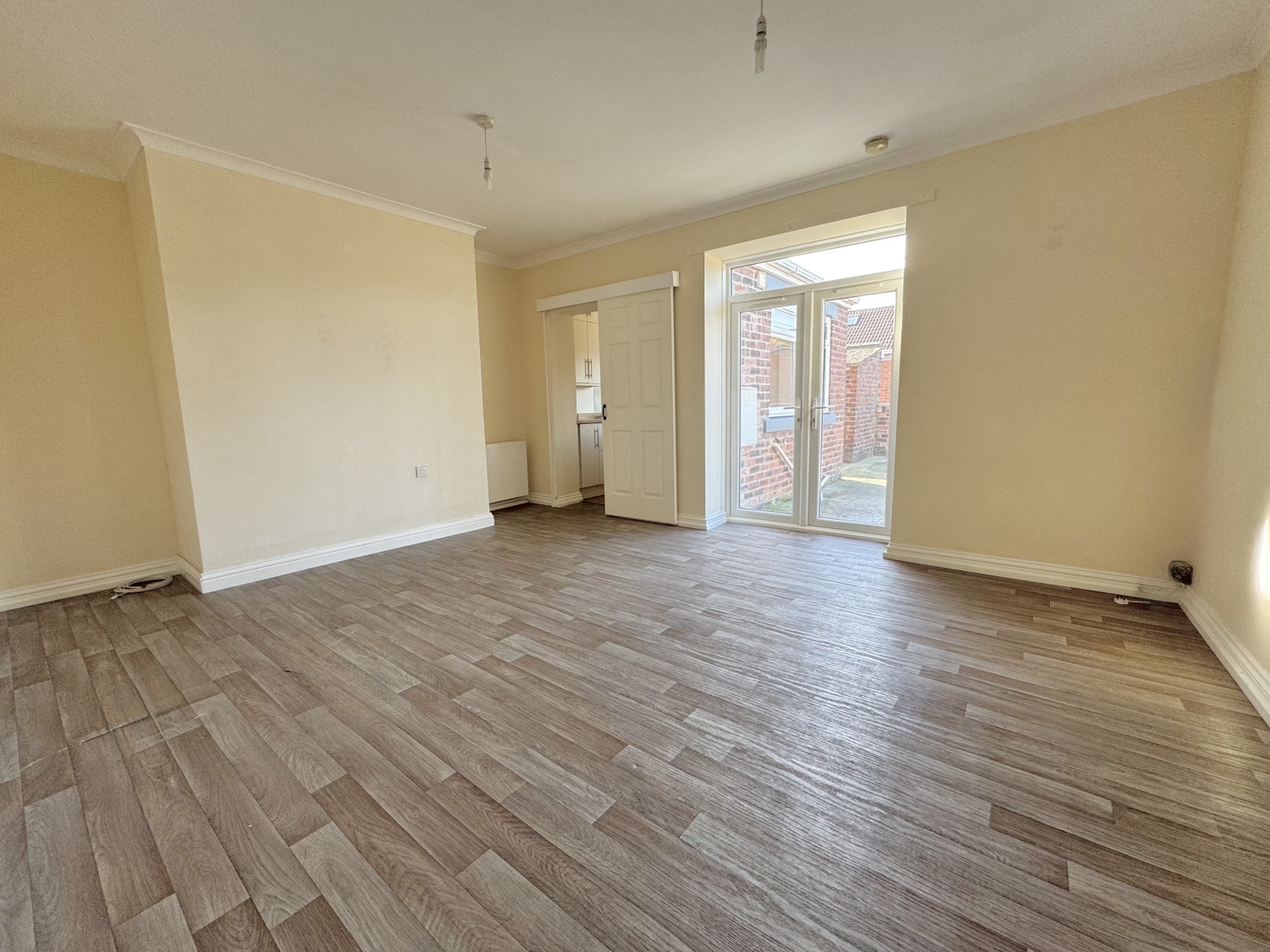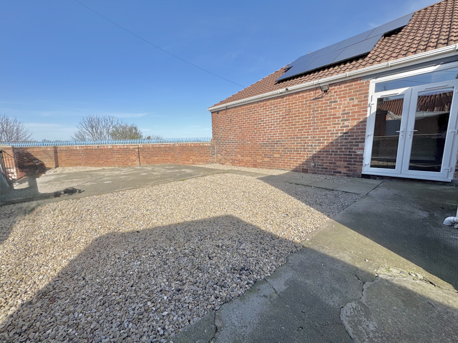 The accommodation comprises an entrance hallway, a spacious lounge featuring UPVC double‑glazed French doors opening onto the rear garden, a fitted kitchen, and a three‑piece bathroom complete with an overhead mains‑fed shower. There are two bedrooms, with the master benefiting from a generous built‑in storage cupboard.