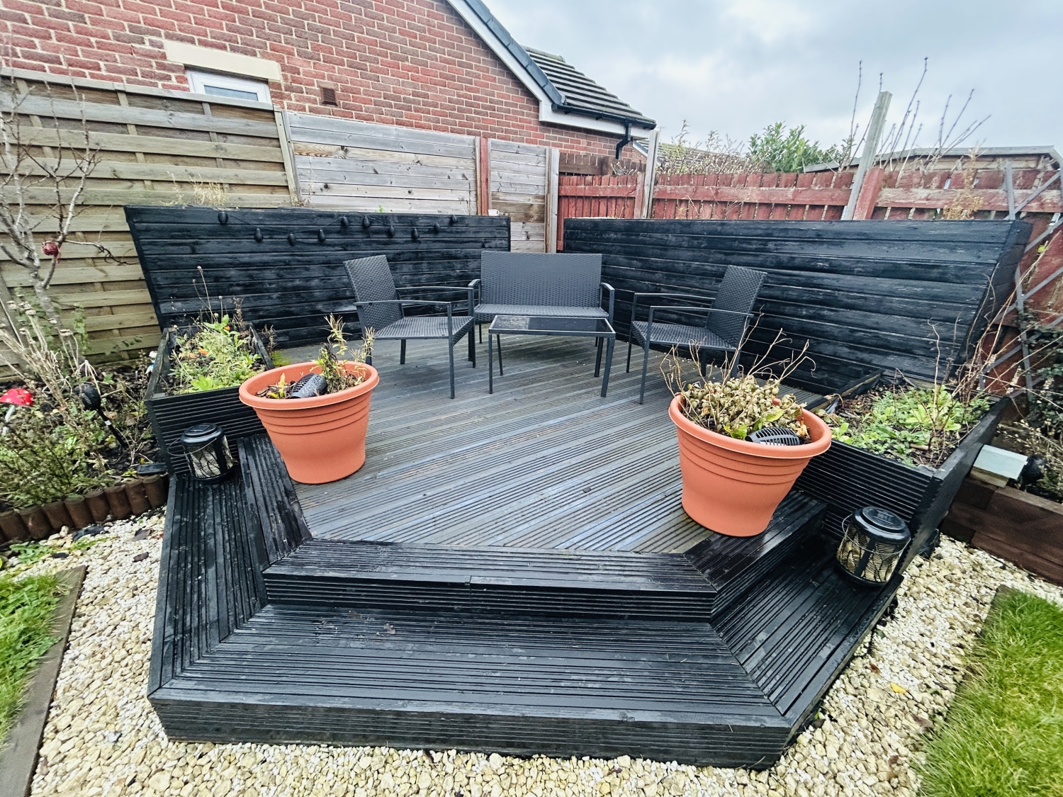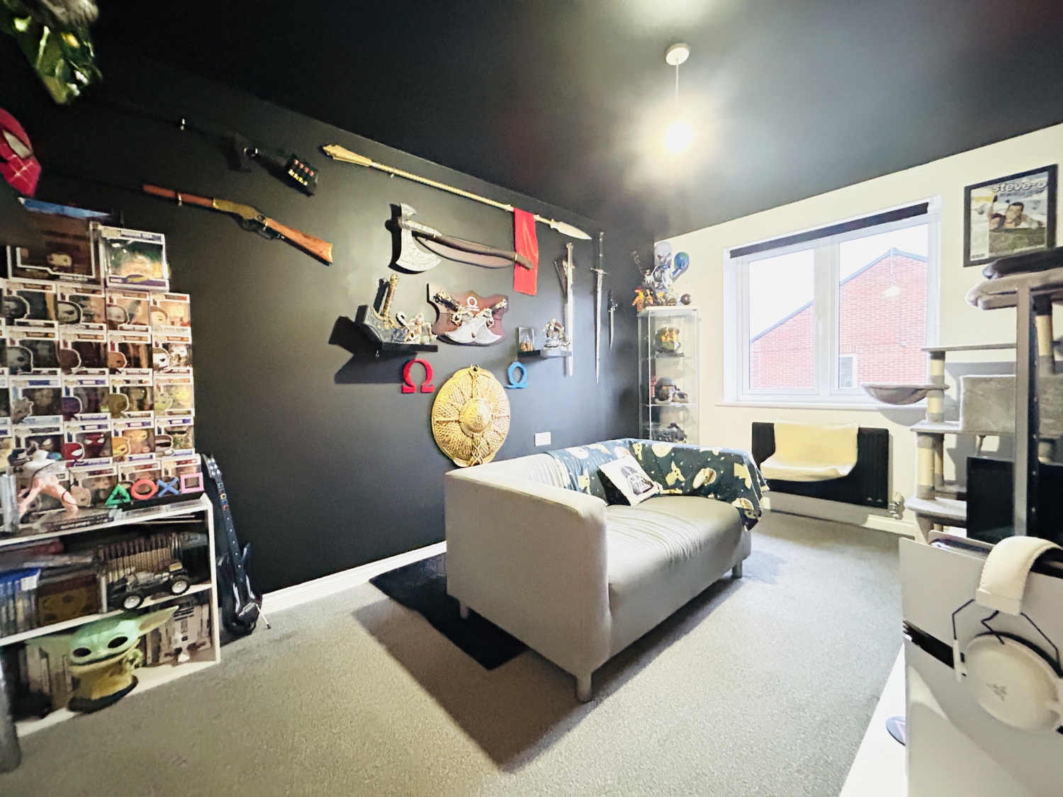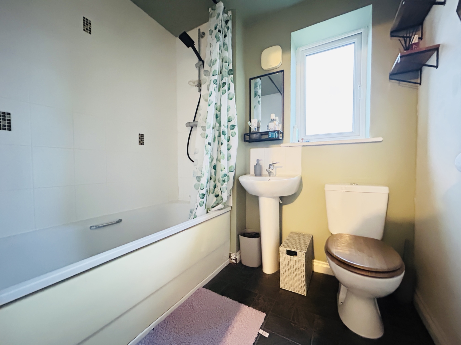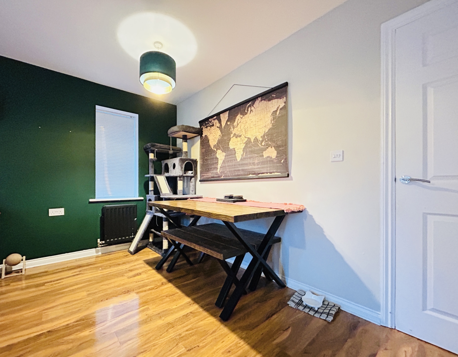Inside, you'll find three well-proportioned bedrooms—two doubles and a spacious single—along with a sleek, contemporary refitted kitchen and a convenient ground-floor cloakroom/WC. The open-plan lounge and dining area is perfect for family life and entertaining, complete with a built-in media wall featuring colour-changing recess lighting and patio doors leading to the rear garden and striking wood effect flooring. Upstairs, a bright landing provides access to built-in storage cupboards and a partially boarded loft with a fixed ladder for additional storage. The modern family bathroom includes a shower over the bath.