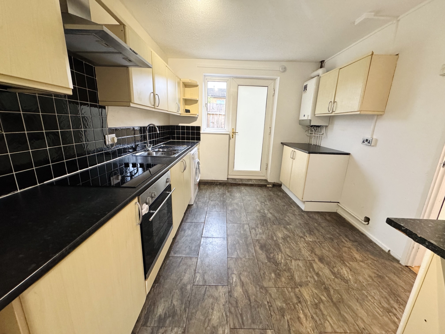 Fitted with a range of fitted base & wall units with splash back tiling, stainless steel sink unit with mixer tap, built in oven, hob & extractor, plumbing for automatic washing machine, space for fridge & freezer, radiator, double glazed window to the front elevation, upvc door to the front elevation
