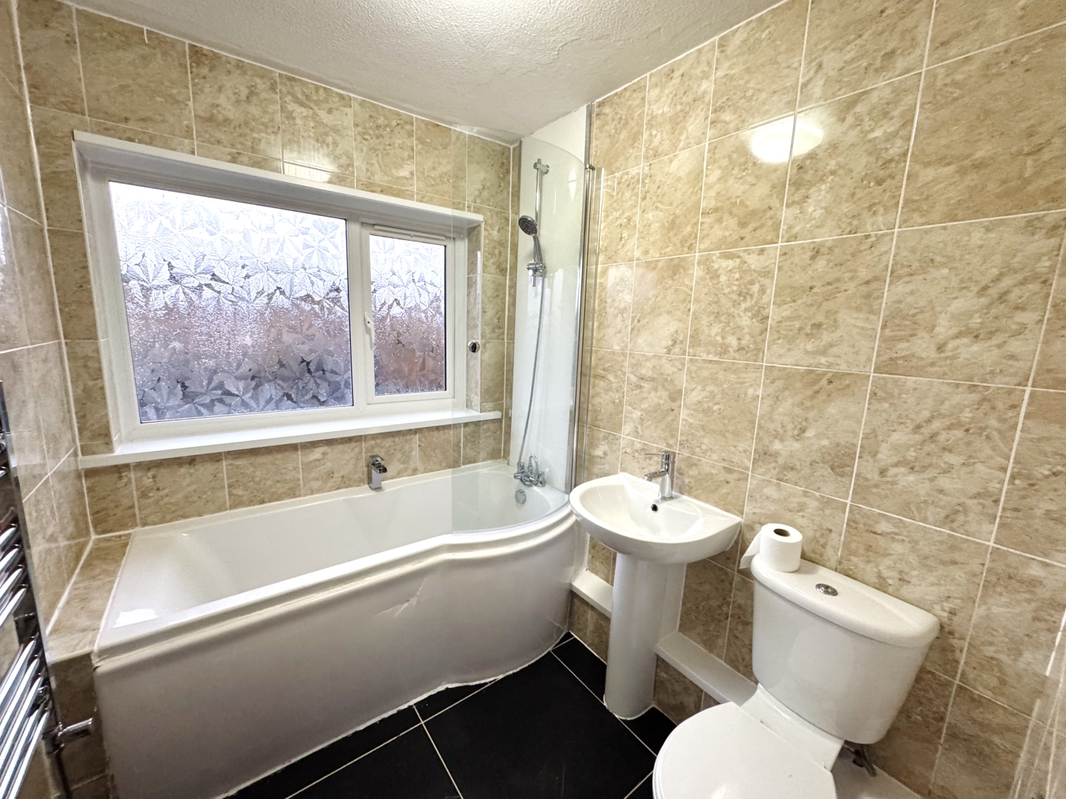 Fitted with a 3 piece suite comprising of; P-shaped bath with shower spray attachment, vanity wash hand basin, low level w/c, heated towel rai, double glazed window to the front elevation